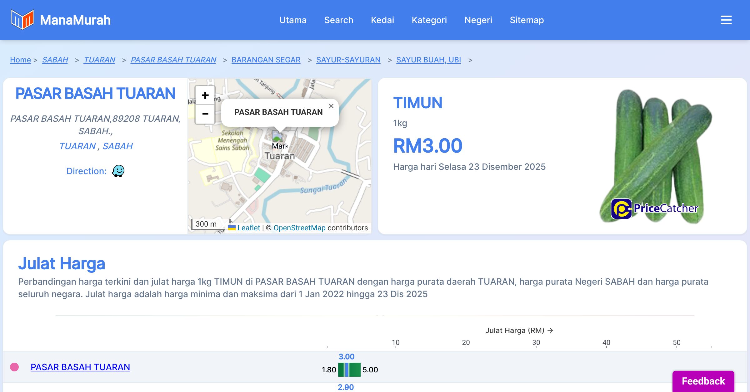 Perbandingan harga terkini dan julat harga 1kg TIMUN di PASAR BASAH TUARAN dengan harga purata daerah TUARAN, harga purata Negeri SABAH dan harga purata seluruh negara. Julat harga adalah harga minima dan maksima dari 1 Jan 2022 hingga 23 Dis 2025