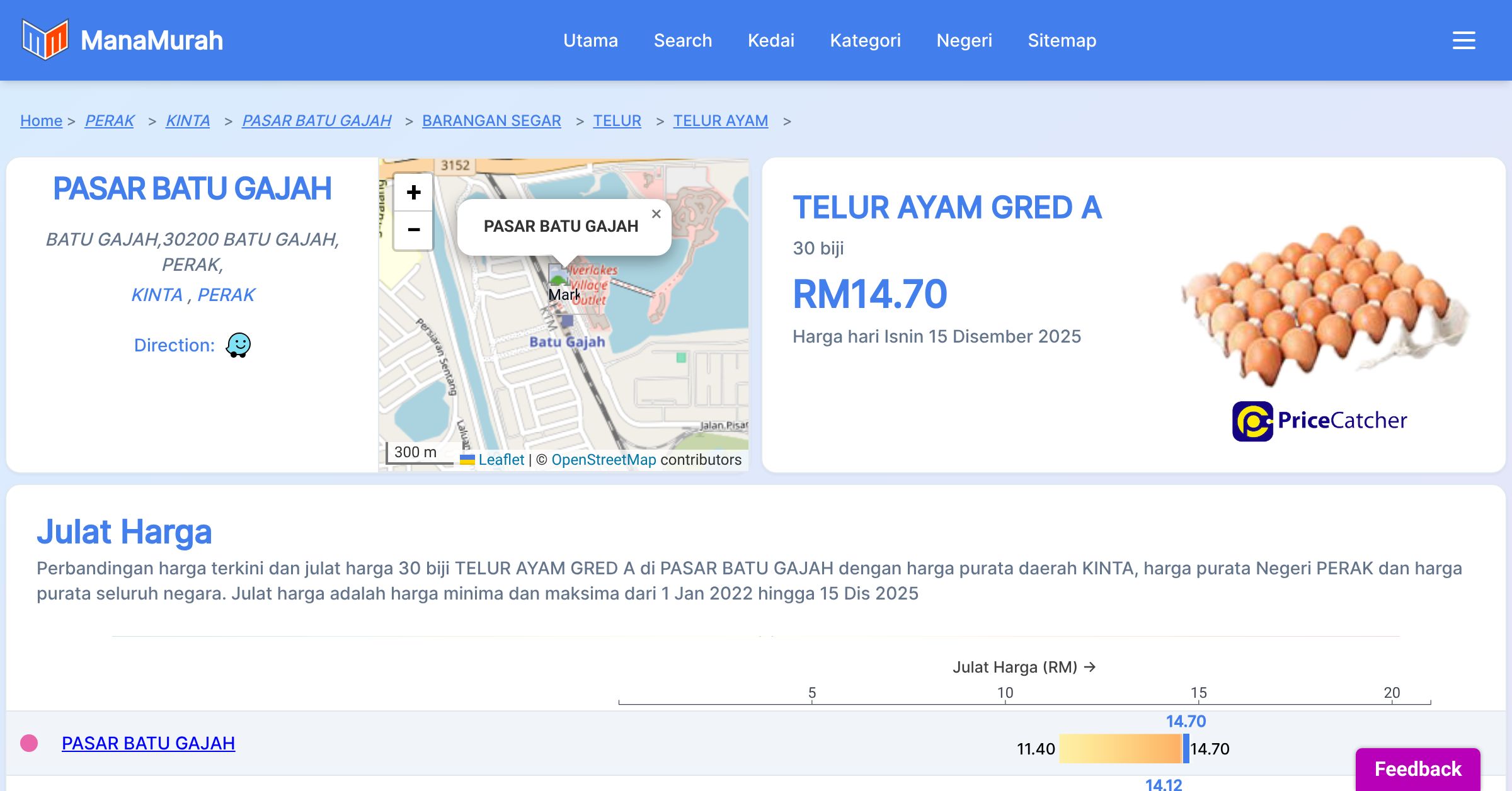 Perbandingan harga terkini dan julat harga 30 biji TELUR AYAM GRED A di PASAR BATU GAJAH dengan harga purata daerah KINTA, harga purata Negeri PERAK dan harga purata seluruh negara. Julat harga adalah harga minima dan maksima dari 1 Jan 2022 hingga 15 Dis 2025