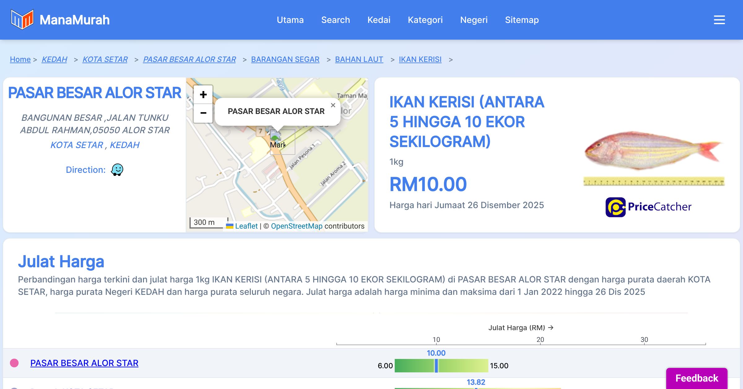 Perbandingan harga terkini dan julat harga 1kg IKAN KERISI (ANTARA 5 HINGGA 10 EKOR SEKILOGRAM) di PASAR BESAR ALOR STAR dengan harga purata daerah KOTA SETAR, harga purata Negeri KEDAH dan harga purata seluruh negara. Julat harga adalah harga minima dan maksima dari 1 Jan 2022 hingga 26 Dis 2025