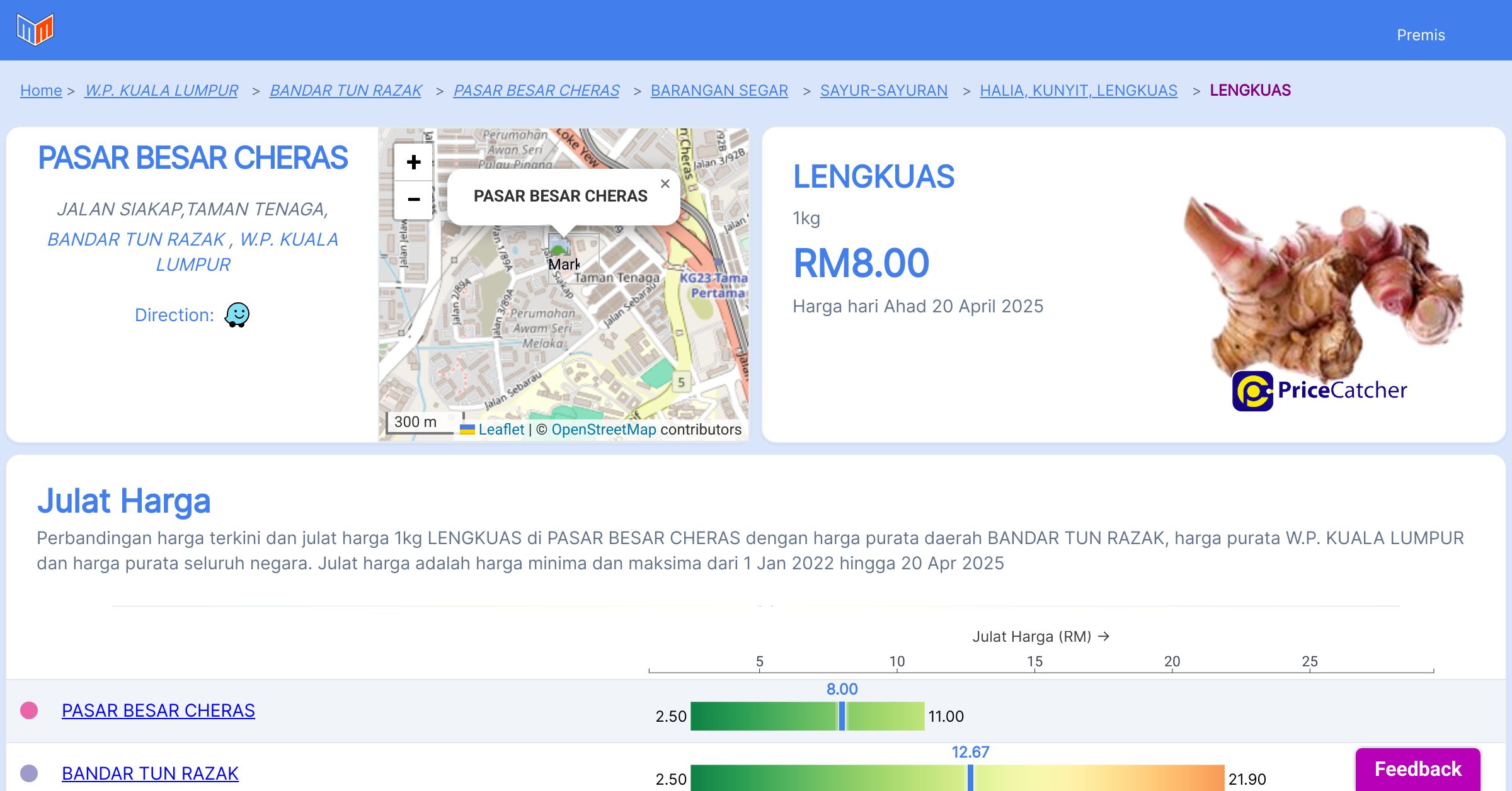 Harga purata bulanan 1kg LENGKUAS di PASAR BESAR CHERAS berbanding harga purata daerah BANDAR TUN RAZAK, harga purata W.P. KUALA LUMPUR dan harga purata seluruh negara