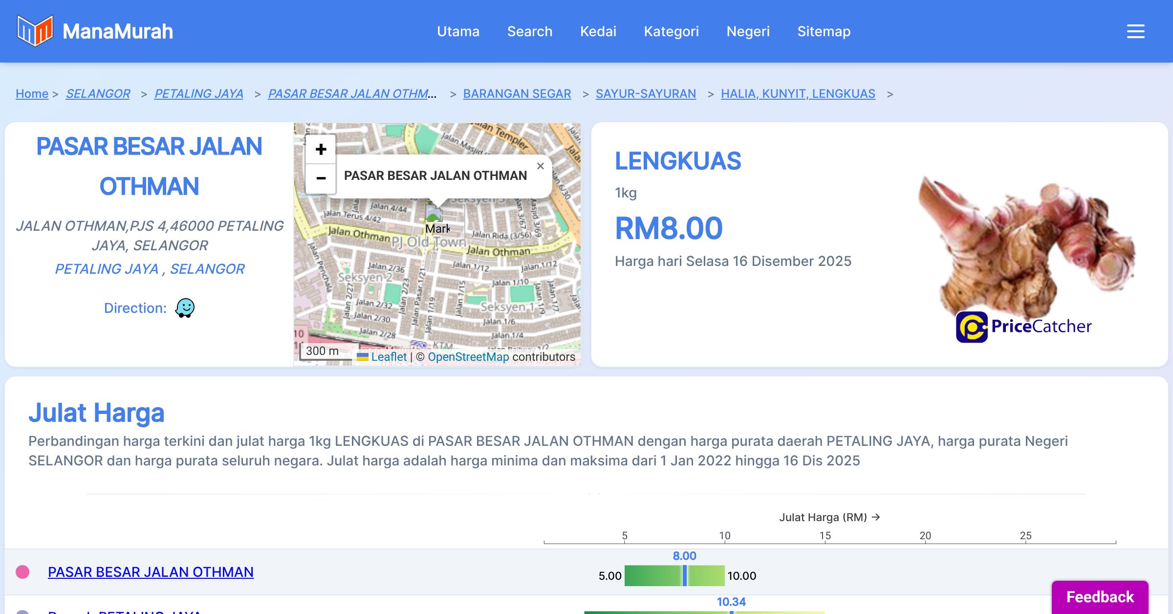 Perbandingan harga terkini dan julat harga 1kg LENGKUAS di PASAR BESAR JALAN OTHMAN dengan harga purata daerah PETALING JAYA, harga purata Negeri SELANGOR dan harga purata seluruh negara. Julat harga adalah harga minima dan maksima dari 1 Jan 2022 hingga 16 Dis 2025