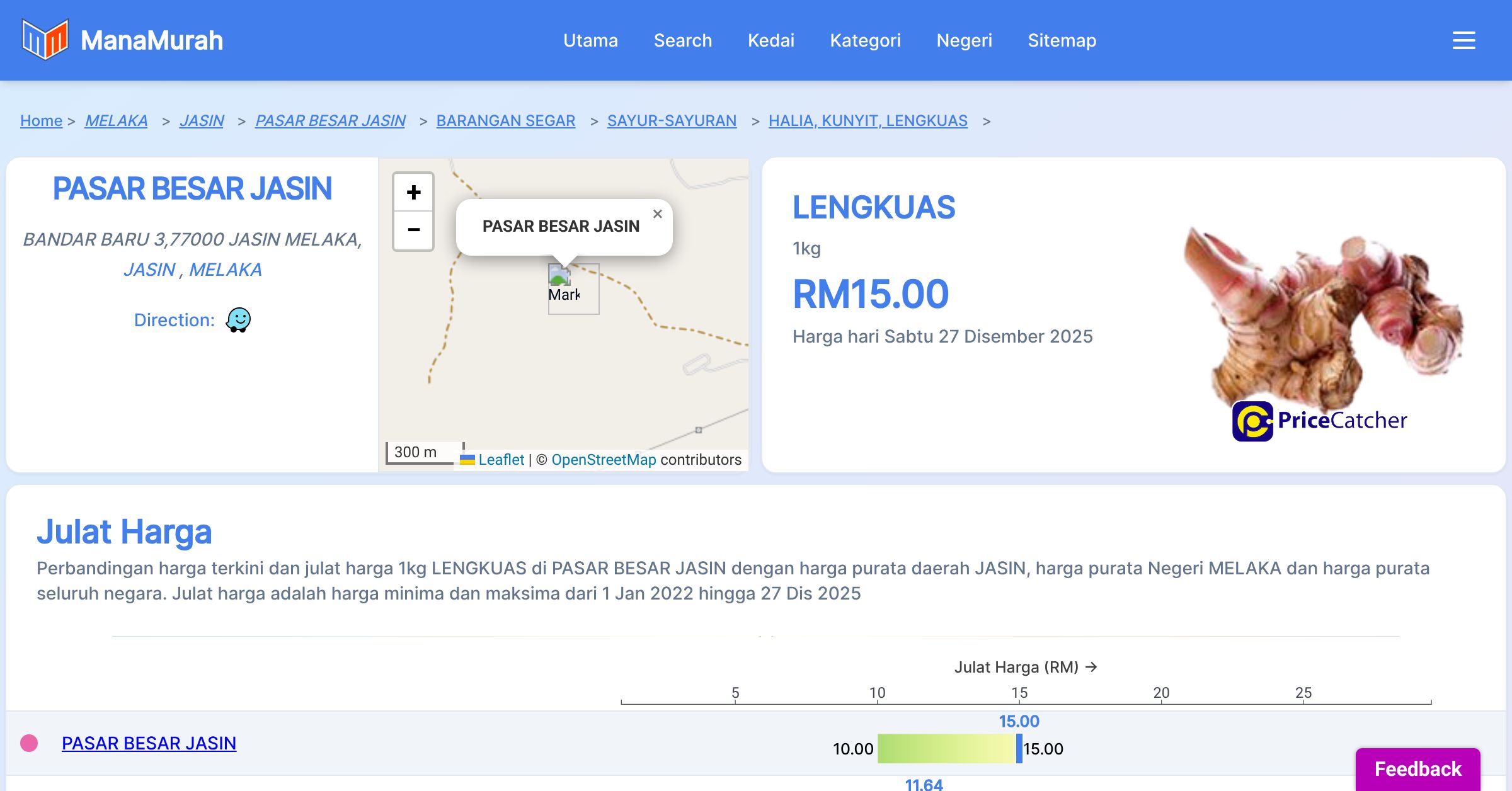 Perbandingan harga terkini dan julat harga 1kg LENGKUAS di PASAR BESAR JASIN dengan harga purata daerah JASIN, harga purata Negeri MELAKA dan harga purata seluruh negara. Julat harga adalah harga minima dan maksima dari 1 Jan 2022 hingga 27 Dis 2025