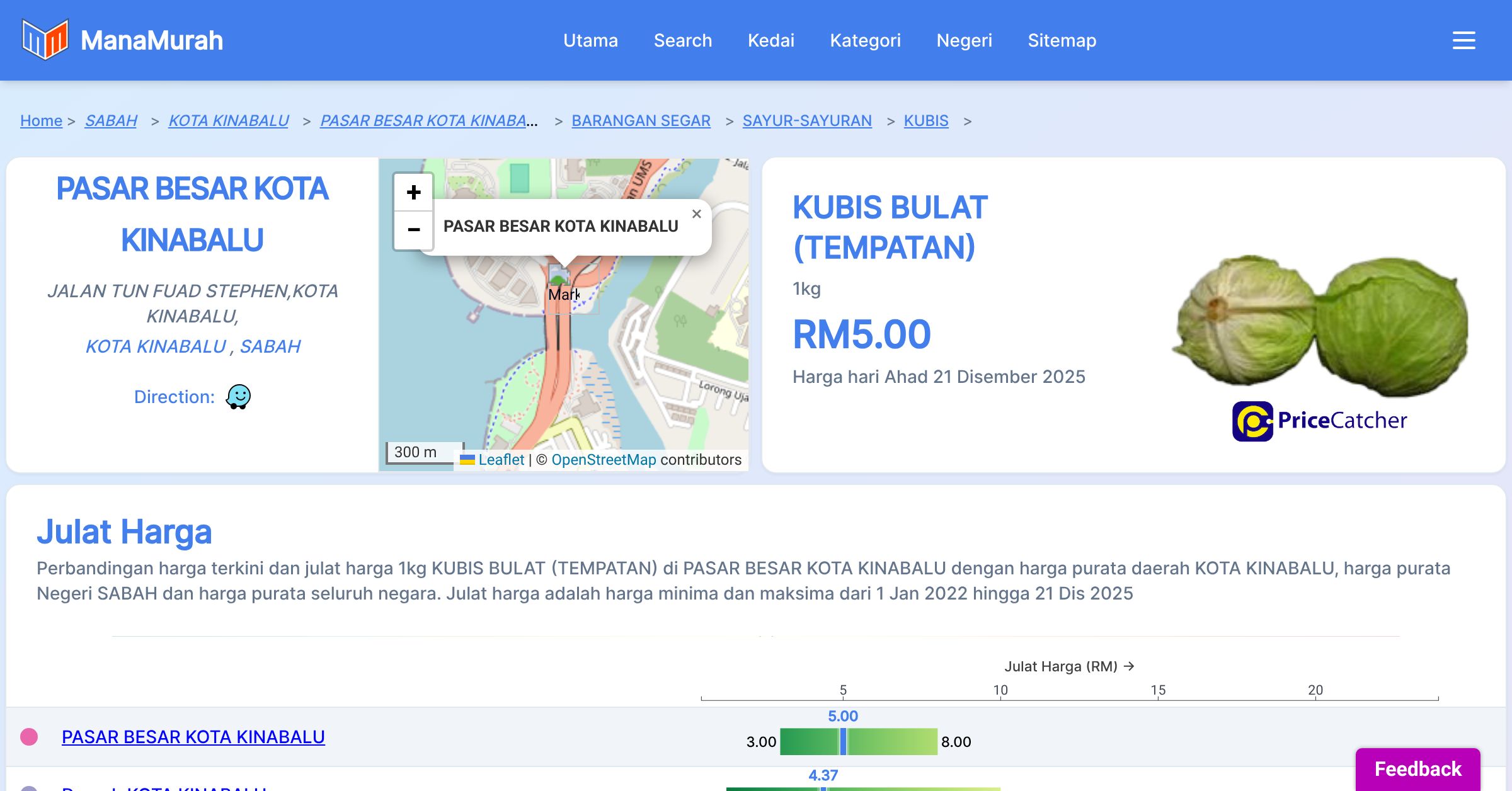 Perbandingan harga terkini dan julat harga 1kg KUBIS BULAT (TEMPATAN) di PASAR BESAR KOTA KINABALU dengan harga purata daerah KOTA KINABALU, harga purata Negeri SABAH dan harga purata seluruh negara. Julat harga adalah harga minima dan maksima dari 1 Jan 2022 hingga 21 Dis 2025