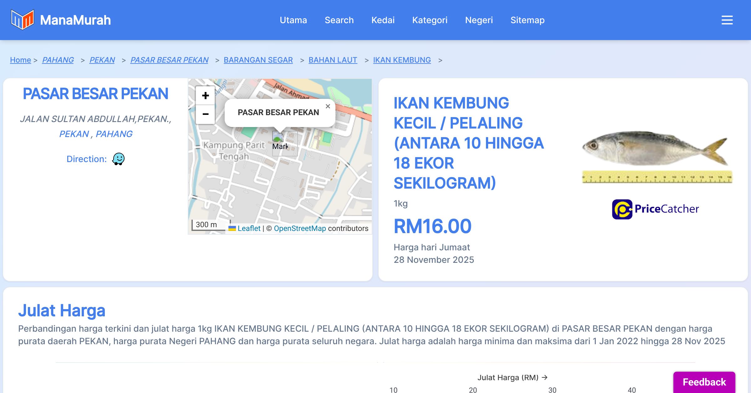 Perbandingan harga terkini dan julat harga 1kg IKAN KEMBUNG KECIL / PELALING (ANTARA 10 HINGGA 18 EKOR SEKILOGRAM) di PASAR BESAR PEKAN dengan harga purata daerah PEKAN, harga purata Negeri PAHANG dan harga purata seluruh negara. Julat harga adalah harga minima dan maksima dari 1 Jan 2022 hingga 28 Nov 2025