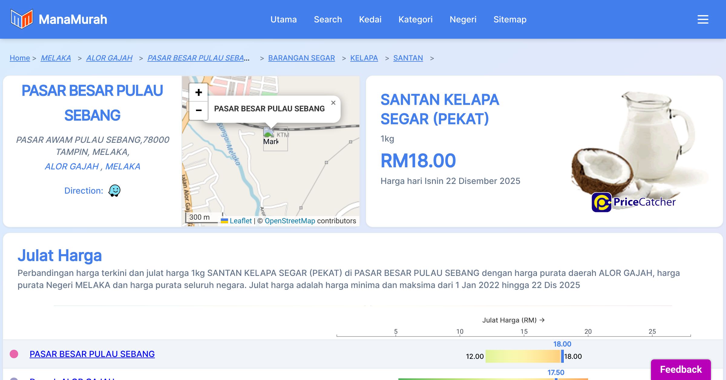 Perubahan harga purata mingguan 1kg SANTAN KELAPA SEGAR (PEKAT) di PASAR BESAR PULAU SEBANG berbanding harga purata mingguan daerah ALOR GAJAH, harga purata mingguan negeri MELAKA dan harga purata mingguan seluruh negara sehingga 22 Dis 2025