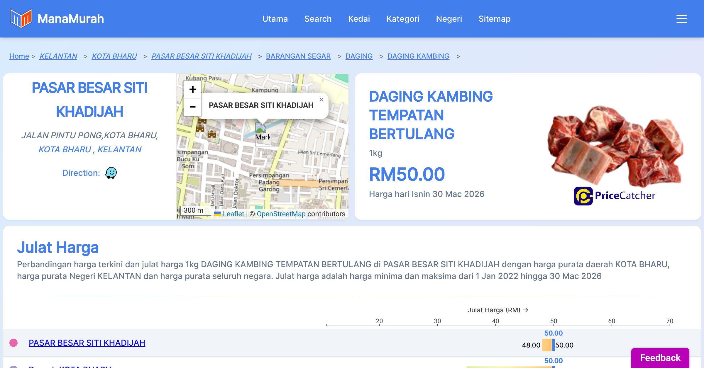 Perbandingan harga terkini dan julat harga 1kg DAGING KAMBING TEMPATAN BERTULANG di PASAR BESAR SITI KHADIJAH dengan harga purata daerah KOTA BHARU, harga purata Negeri KELANTAN dan harga purata seluruh negara. Julat harga adalah harga minima dan maksima dari 1 Jan 2022 hingga 30 Mac 2026