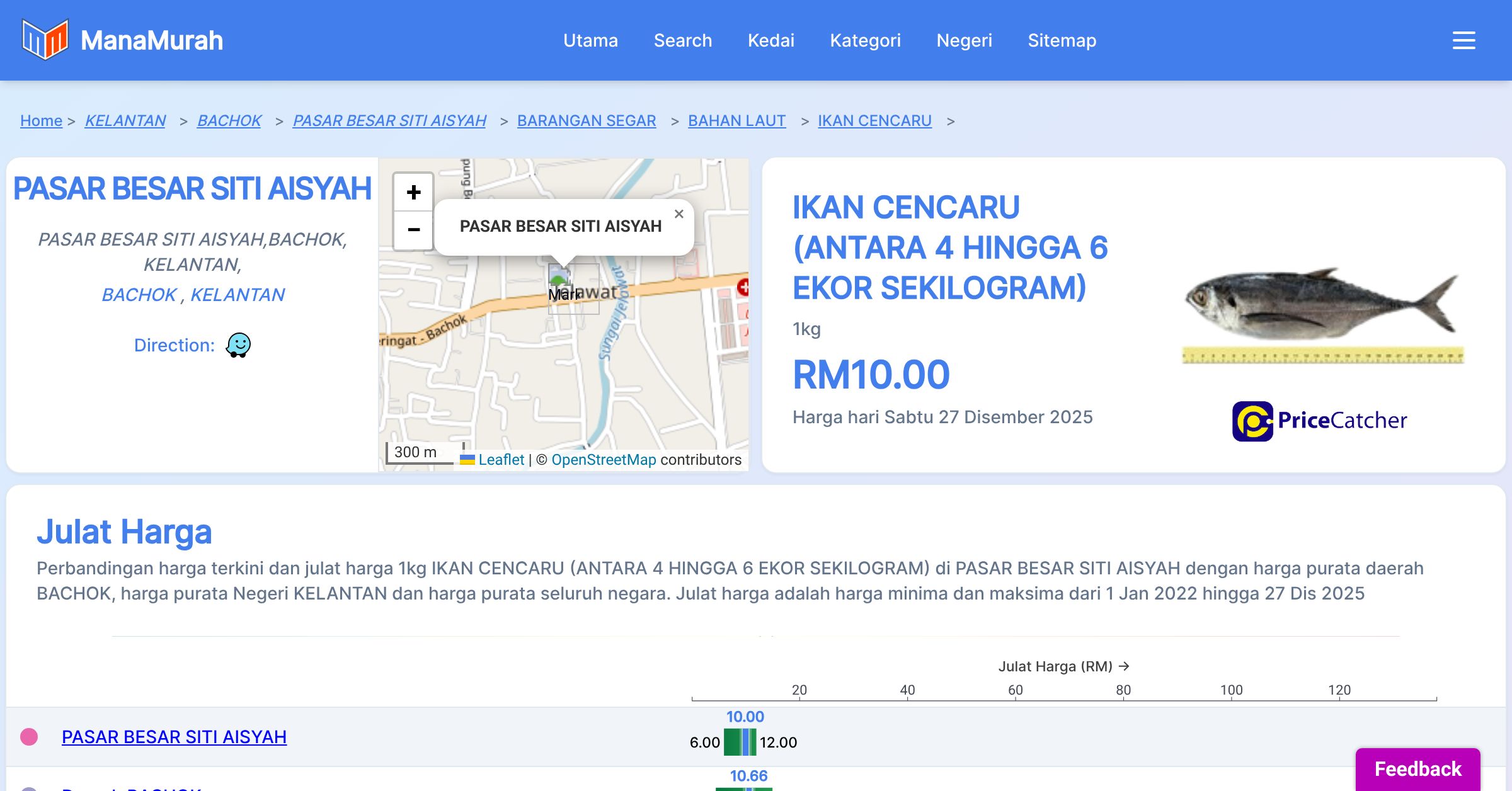 Perbandingan harga terkini dan julat harga 1kg IKAN CENCARU (ANTARA 4 HINGGA 6 EKOR SEKILOGRAM) di PASAR BESAR SITI AISYAH dengan harga purata daerah BACHOK, harga purata Negeri KELANTAN dan harga purata seluruh negara. Julat harga adalah harga minima dan maksima dari 1 Jan 2022 hingga 27 Dis 2025