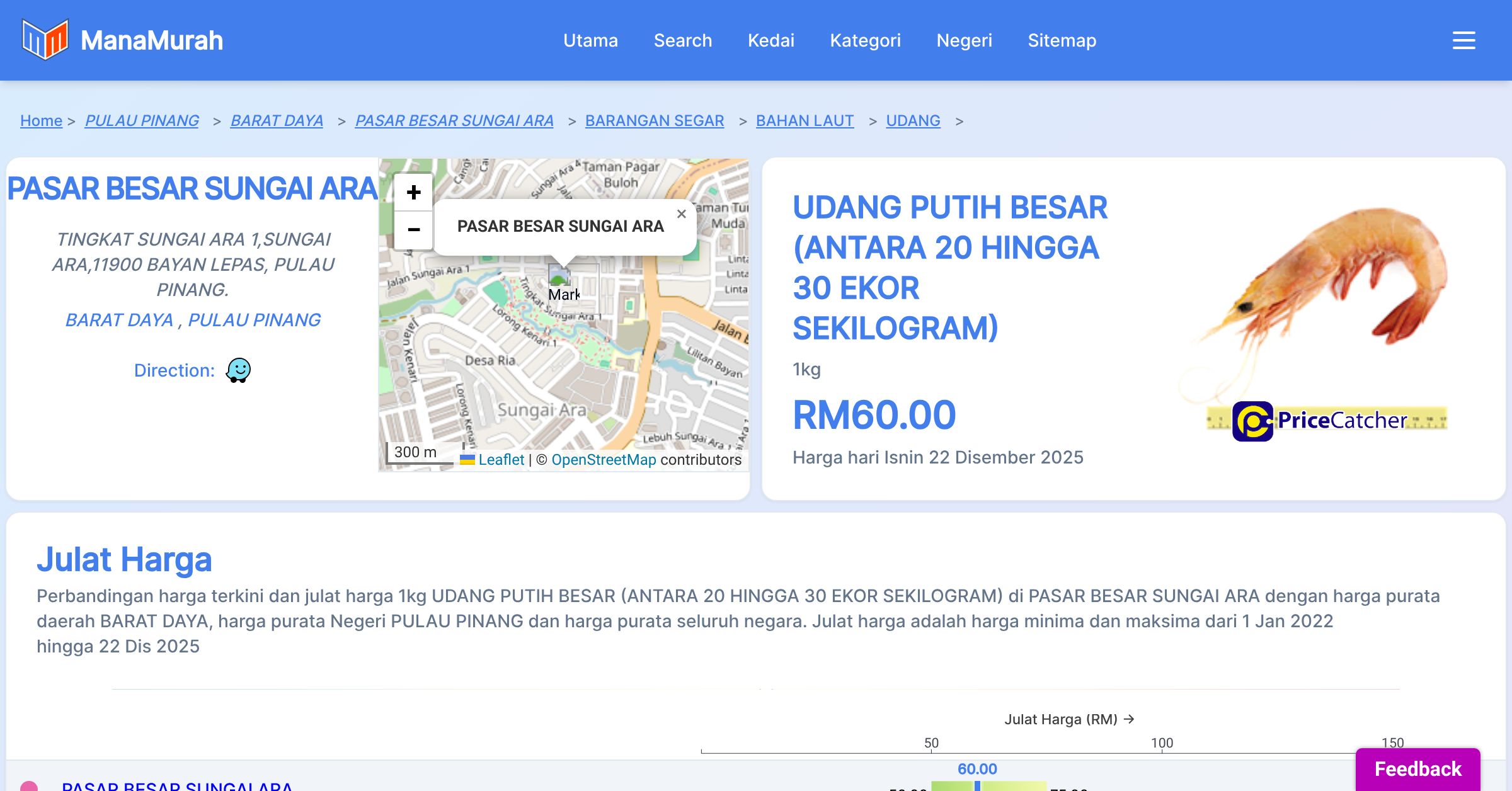Perbandingan harga terkini dan julat harga 1kg UDANG PUTIH BESAR (ANTARA 20 HINGGA 30 EKOR SEKILOGRAM) di PASAR BESAR SUNGAI ARA dengan harga purata daerah BARAT DAYA, harga purata Negeri PULAU PINANG dan harga purata seluruh negara. Julat harga adalah harga minima dan maksima dari 1 Jan 2022 hingga 22 Dis 2025
