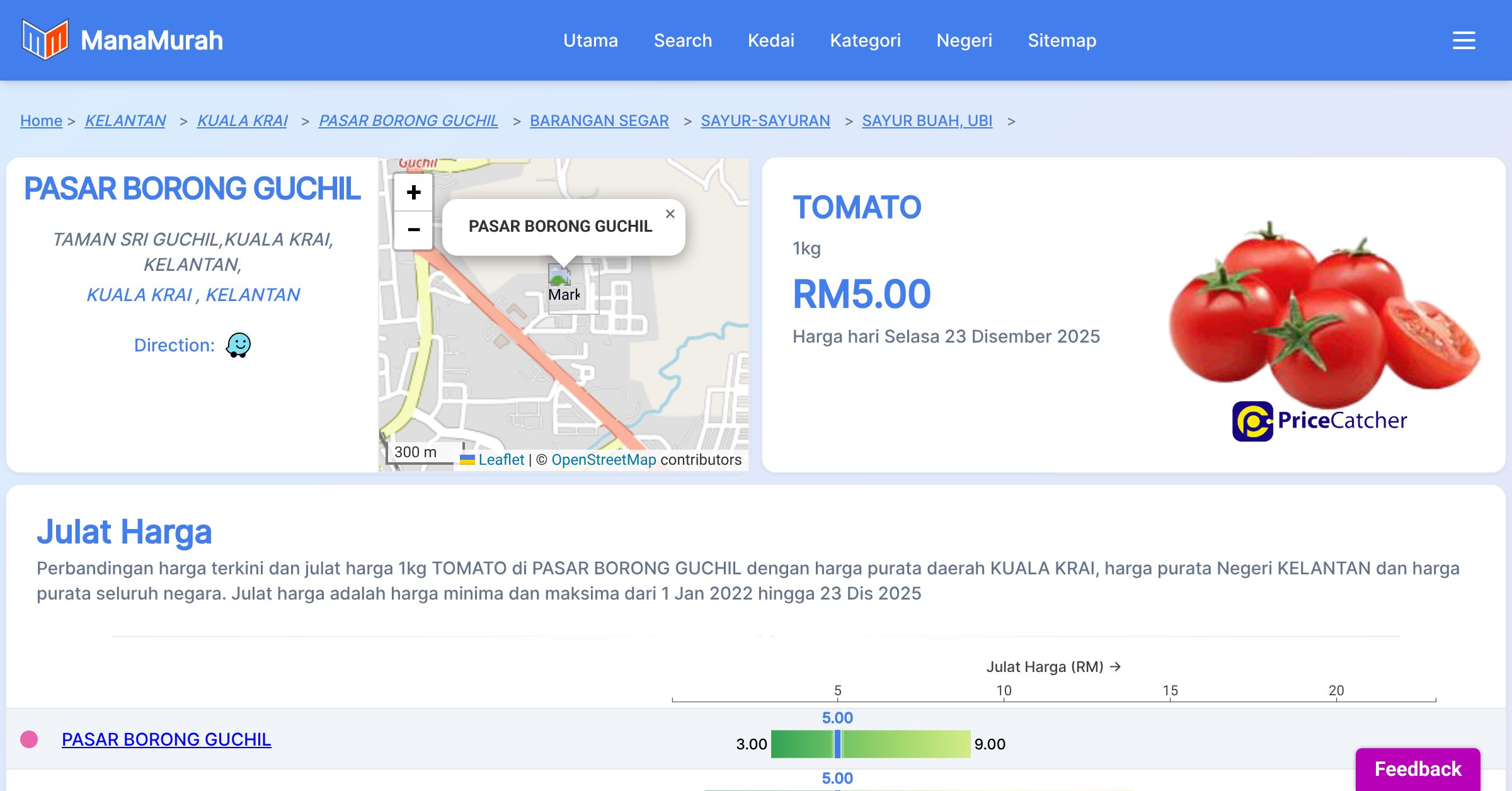 Perbandingan harga terkini dan julat harga 1kg TOMATO di PASAR BORONG GUCHIL dengan harga purata daerah KUALA KRAI, harga purata Negeri KELANTAN dan harga purata seluruh negara. Julat harga adalah harga minima dan maksima dari 1 Jan 2022 hingga 23 Dis 2025