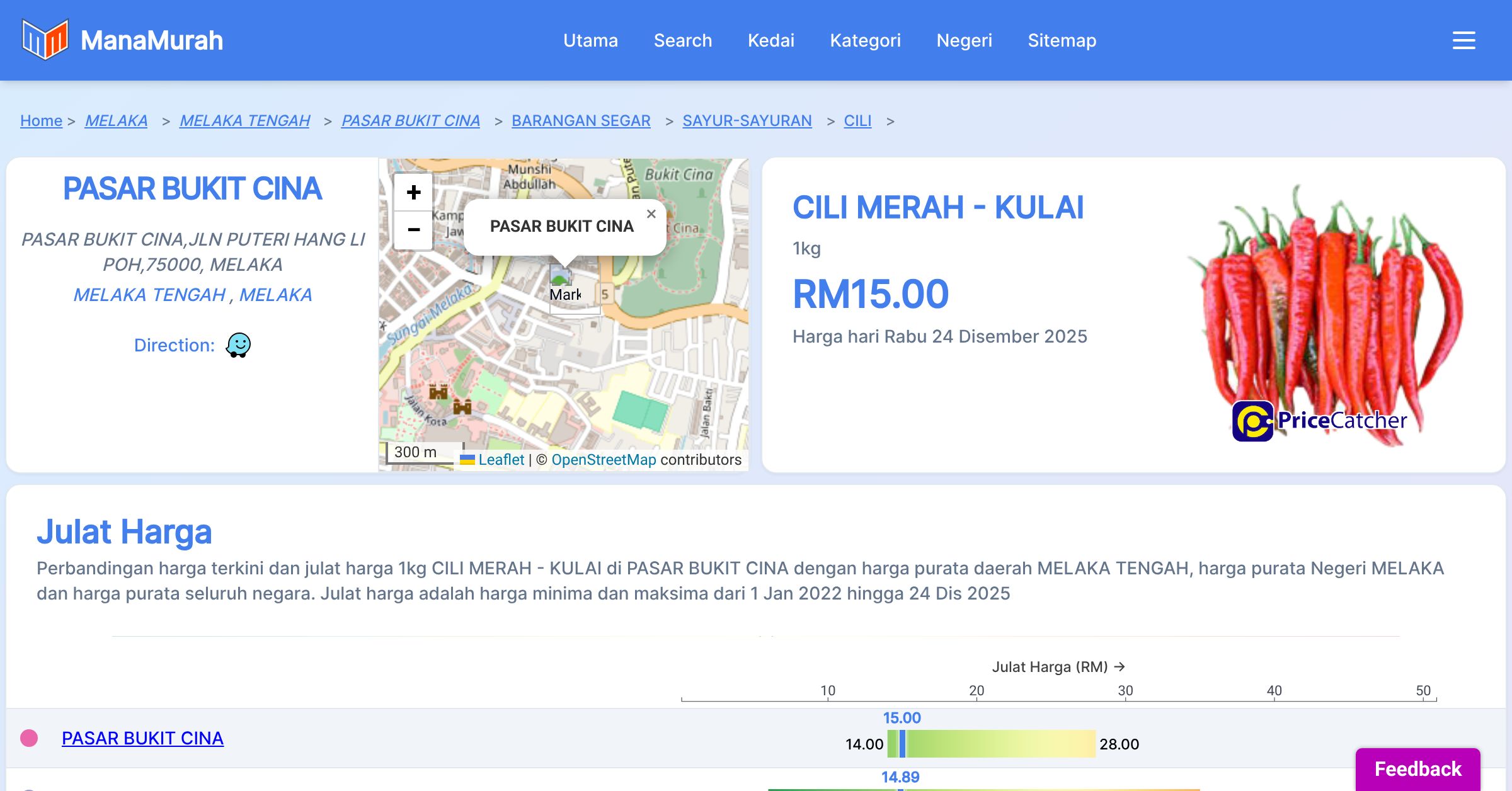 Perbandingan harga terkini dan julat harga 1kg CILI MERAH - KULAI di PASAR BUKIT CINA dengan harga purata daerah MELAKA TENGAH, harga purata Negeri MELAKA dan harga purata seluruh negara. Julat harga adalah harga minima dan maksima dari 1 Jan 2022 hingga 24 Dis 2025
