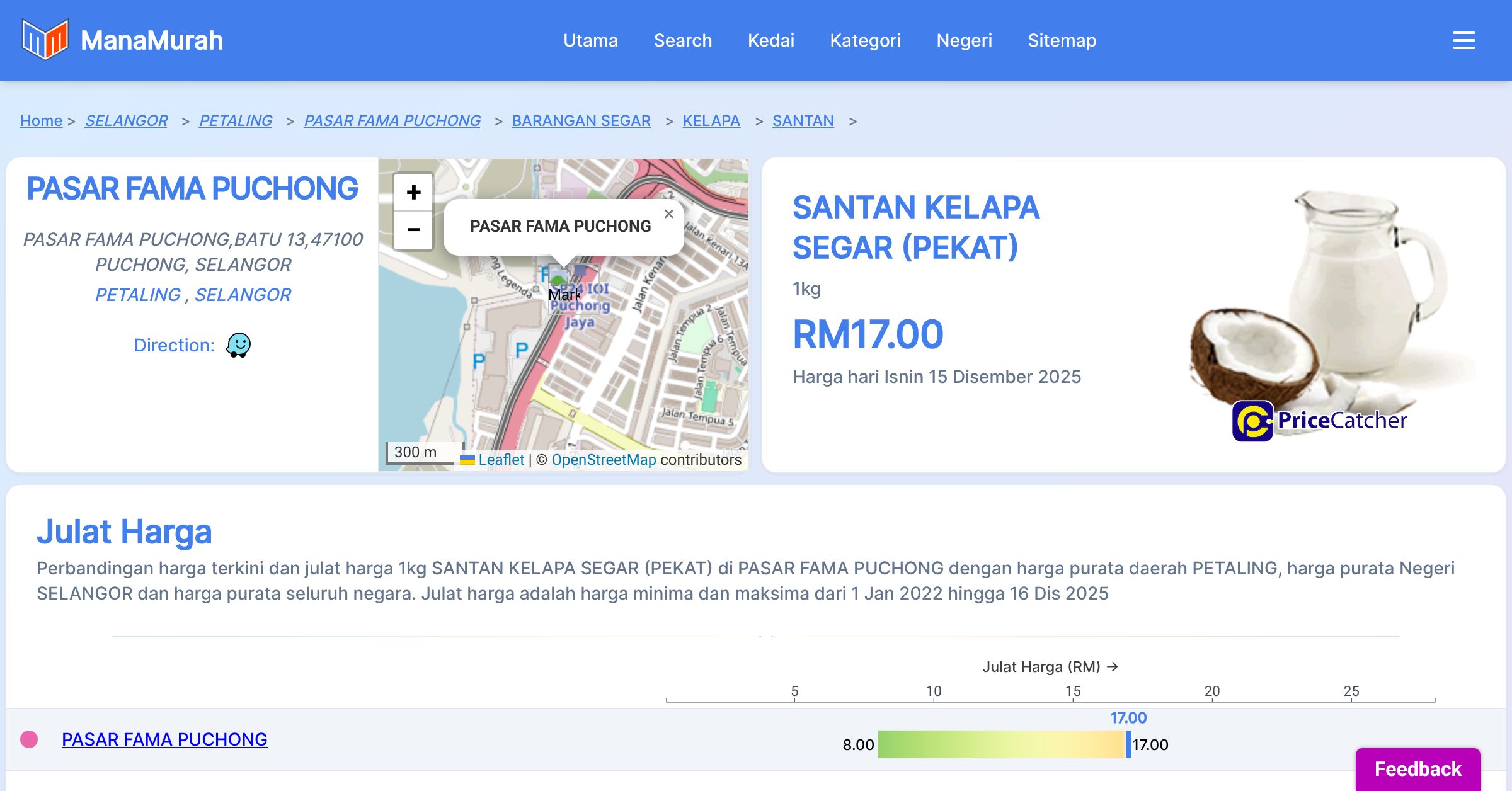 Harga purata tahunan 1kg SANTAN KELAPA SEGAR (PEKAT) di PASAR FAMA PUCHONG berbanding harga purata daerah PETALING, harga purata Negeri SELANGOR dan harga purata seluruh negara