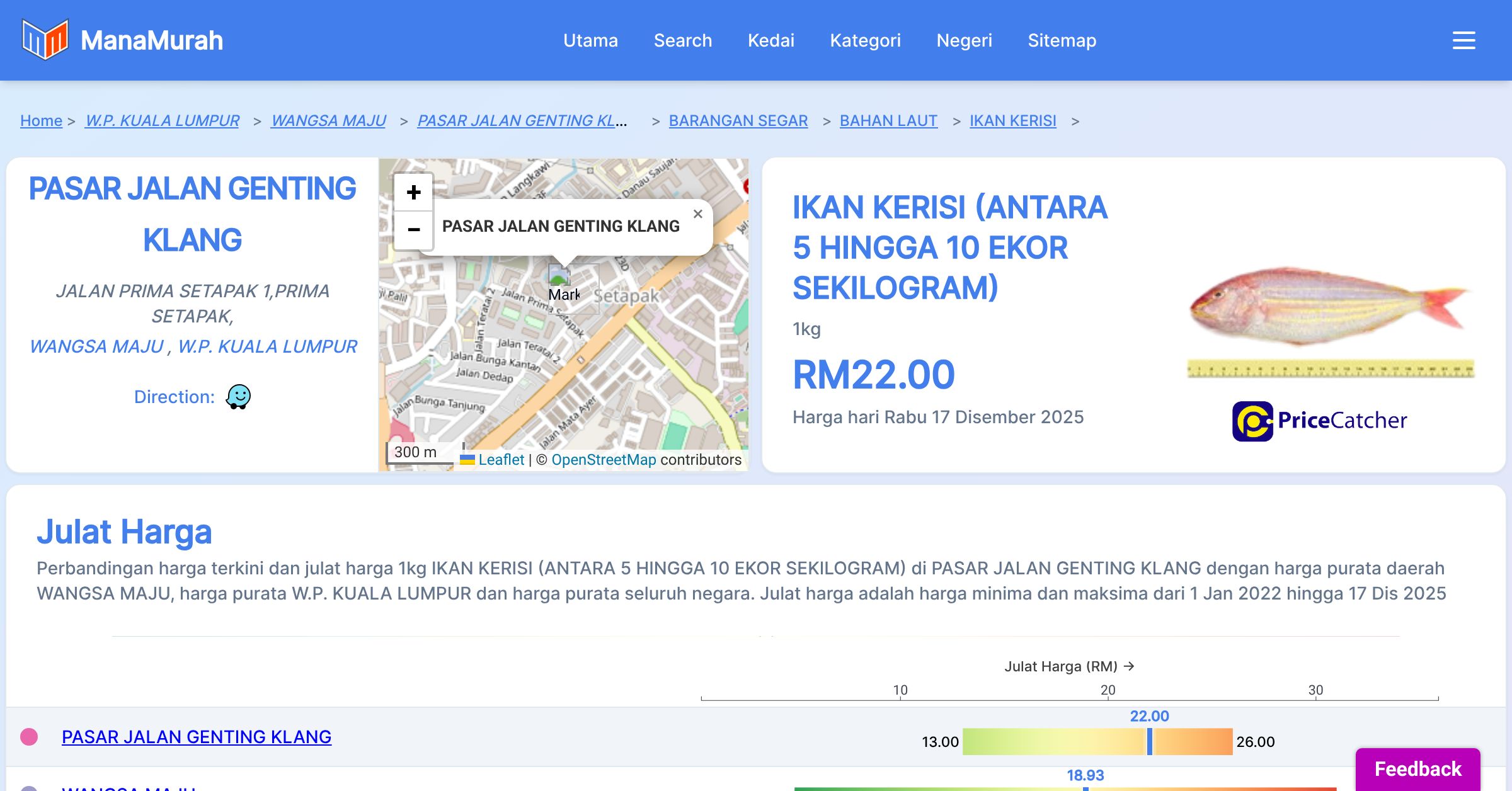 Perbandingan harga terkini dan julat harga 1kg IKAN KERISI (ANTARA 5 HINGGA 10 EKOR SEKILOGRAM) di PASAR JALAN GENTING KLANG dengan harga purata daerah WANGSA MAJU, harga purata W.P. KUALA LUMPUR dan harga purata seluruh negara. Julat harga adalah harga minima dan maksima dari 1 Jan 2022 hingga 17 Dis 2025
