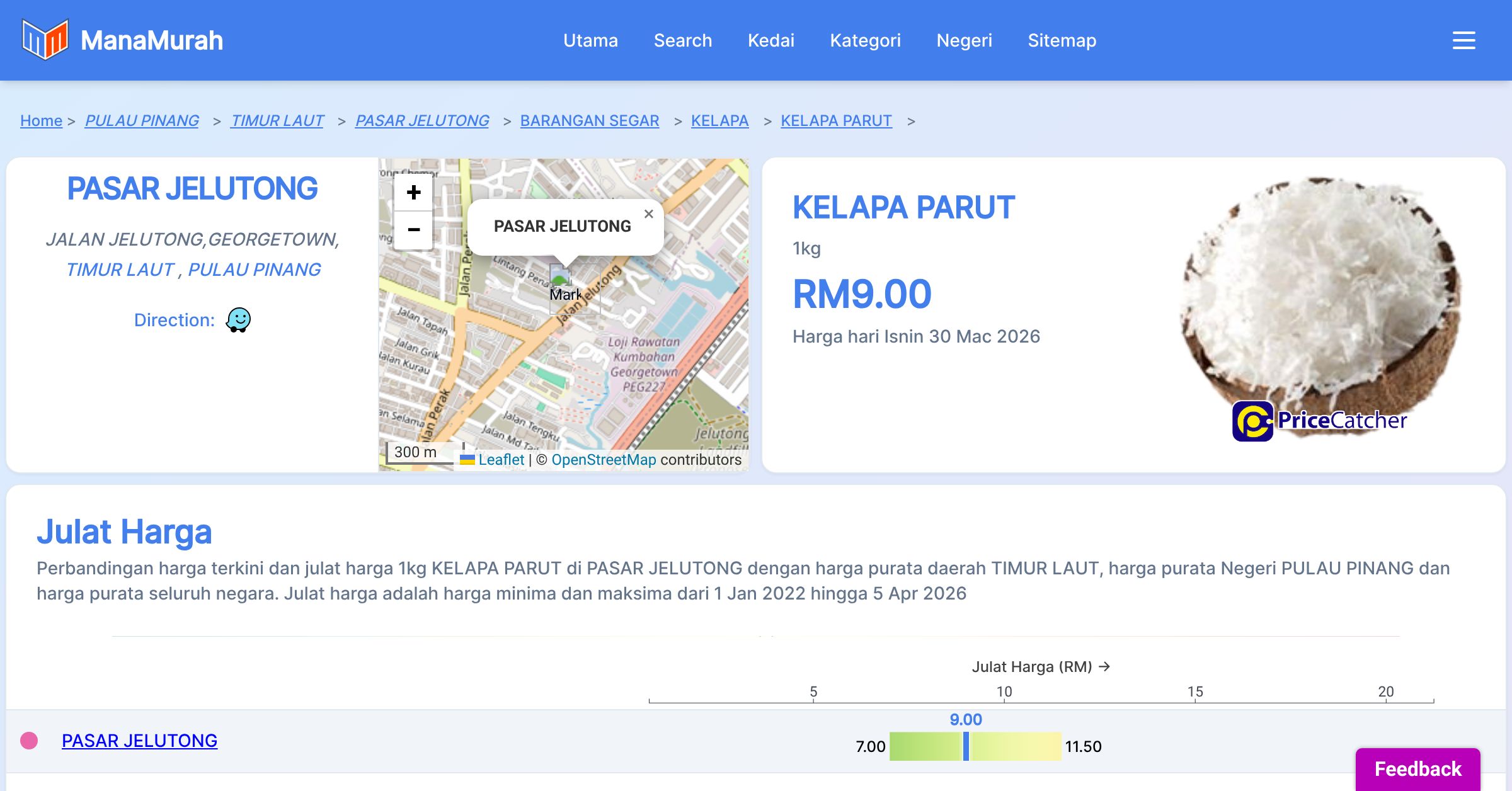 Perbandingan harga terkini dan julat harga 1kg KELAPA PARUT di PASAR JELUTONG dengan harga purata daerah TIMUR LAUT, harga purata Negeri PULAU PINANG dan harga purata seluruh negara. Julat harga adalah harga minima dan maksima dari 1 Jan 2022 hingga 30 Mac 2026