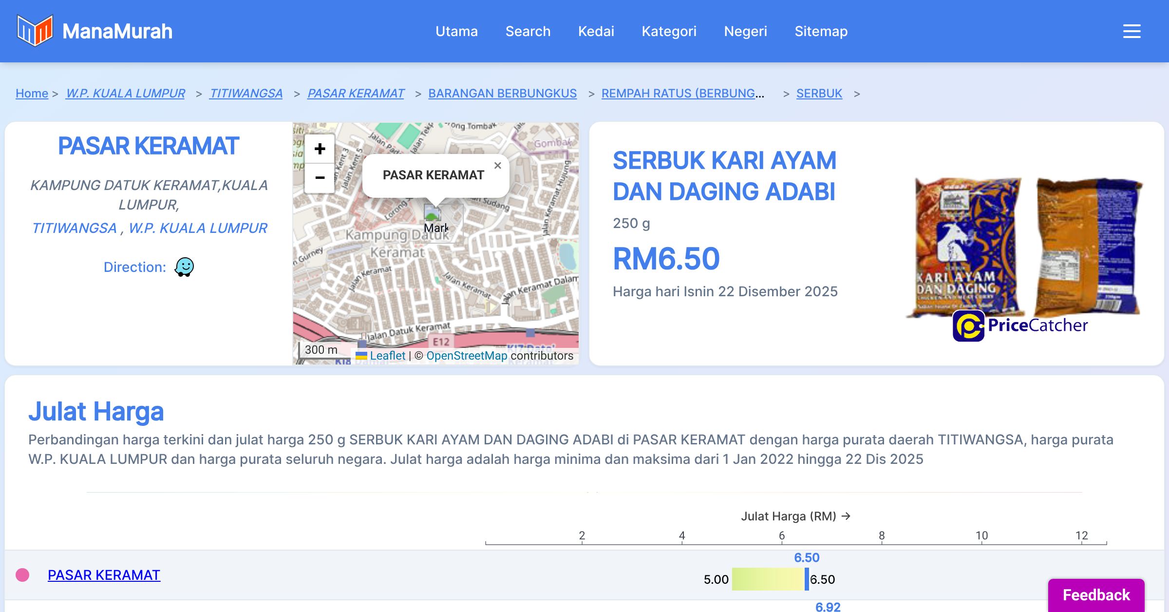 Perubahan harga purata mingguan 250 g SERBUK KARI AYAM DAN DAGING ADABI di PASAR KERAMAT berbanding harga purata mingguan daerah TITIWANGSA, harga purata mingguan negeri W.P. KUALA LUMPUR dan harga purata mingguan seluruh negara sehingga 22 Dis 2025