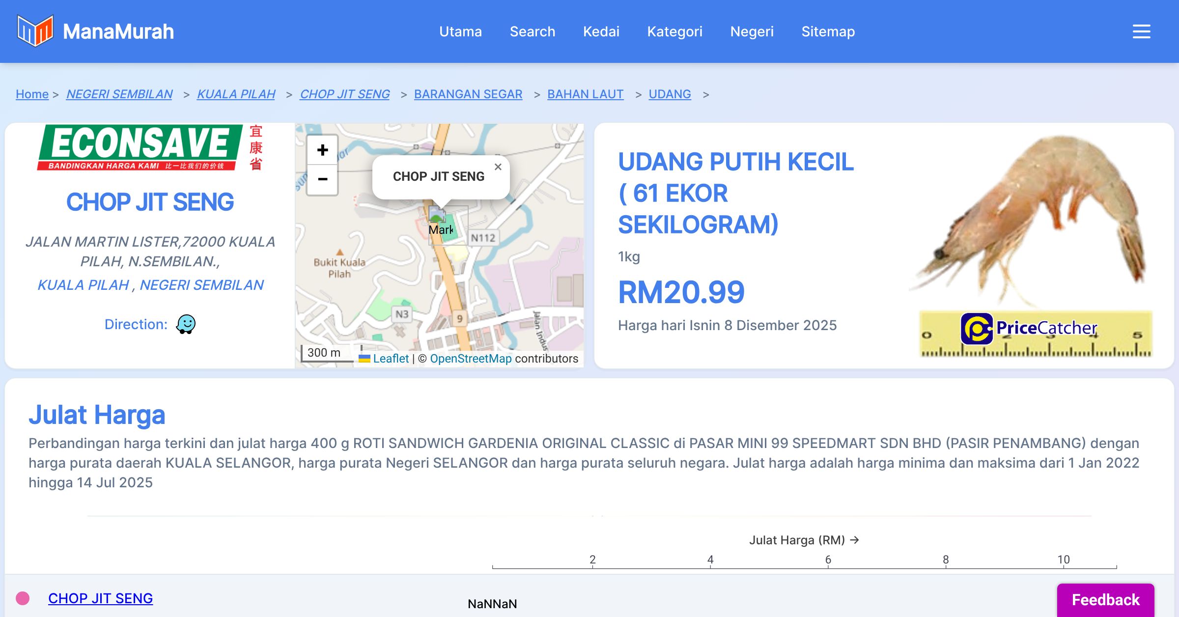 Perbandingan harga terkini dan julat harga 400 g ROTI SANDWICH GARDENIA ORIGINAL CLASSIC di PASAR MINI 99 SPEEDMART SDN BHD (PASIR PENAMBANG) dengan harga purata daerah KUALA SELANGOR, harga purata Negeri SELANGOR dan harga purata seluruh negara. Julat harga adalah harga minima dan maksima dari 1 Jan 2022 hingga 14 Jul 2025