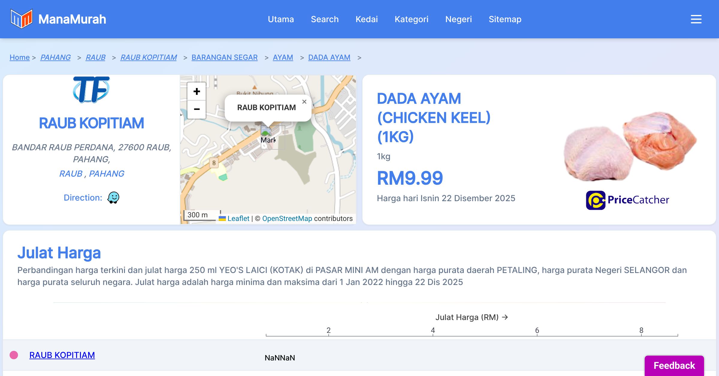 Perbandingan harga terkini dan julat harga 250 ml YEO'S LAICI (KOTAK) di PASAR MINI AM dengan harga purata daerah PETALING, harga purata Negeri SELANGOR dan harga purata seluruh negara. Julat harga adalah harga minima dan maksima dari 1 Jan 2022 hingga 22 Dis 2025