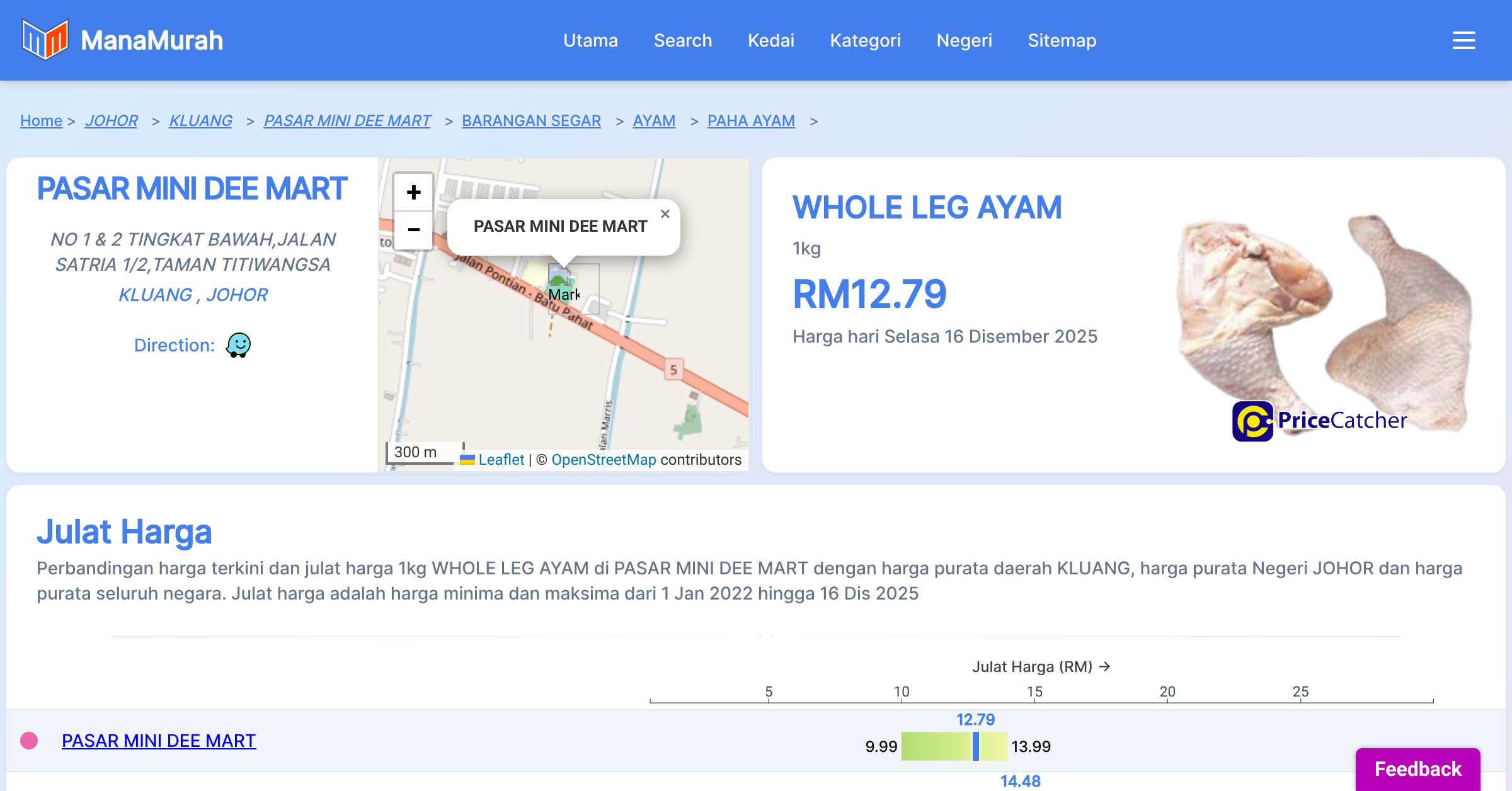 Perubahan harga purata mingguan 1kg WHOLE LEG AYAM di PASAR MINI DEE MART berbanding harga purata mingguan daerah KLUANG, harga purata mingguan negeri JOHOR dan harga purata mingguan seluruh negara sehingga 16 Dis 2025