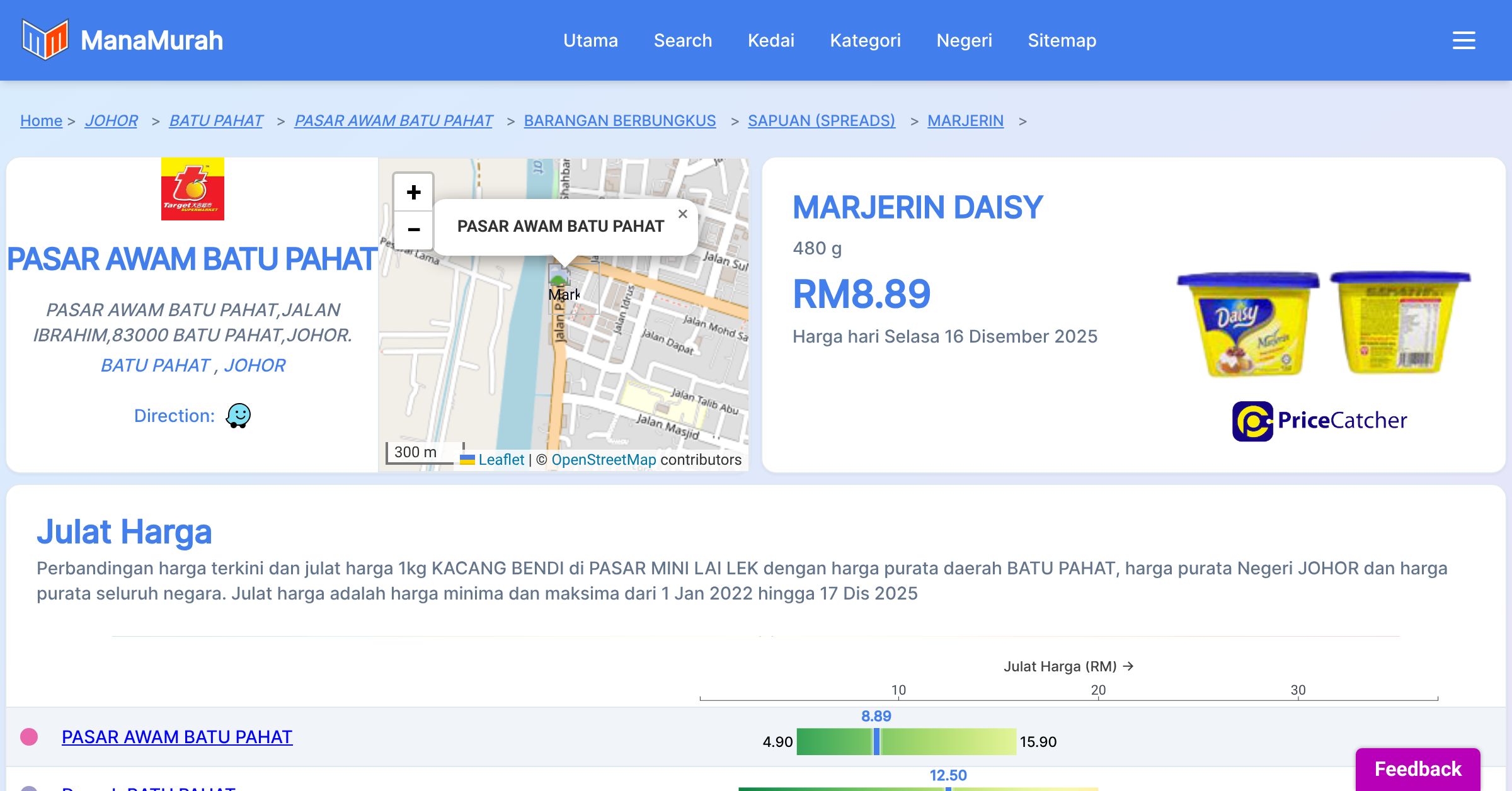Perbandingan harga terkini dan julat harga 1kg KACANG BENDI di PASAR MINI LAI LEK dengan harga purata daerah BATU PAHAT, harga purata Negeri JOHOR dan harga purata seluruh negara. Julat harga adalah harga minima dan maksima dari 1 Jan 2022 hingga 17 Dis 2025