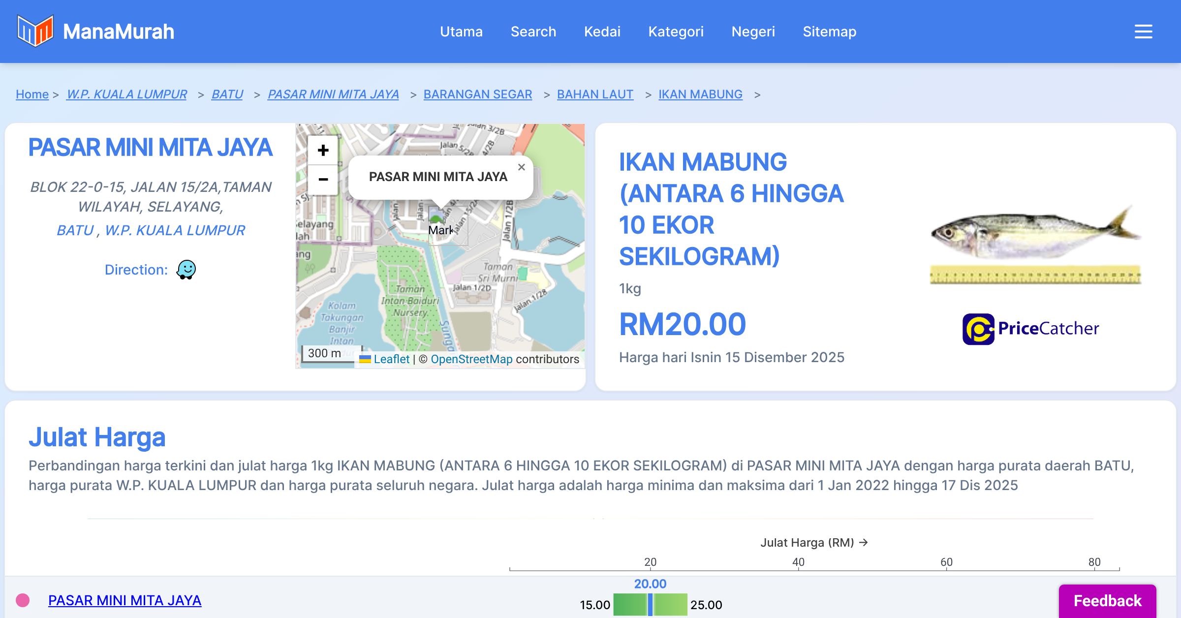 Perbandingan harga terkini dan julat harga 1kg IKAN MABUNG (ANTARA 6 HINGGA 10 EKOR SEKILOGRAM) di PASAR MINI MITA JAYA dengan harga purata daerah BATU, harga purata W.P. KUALA LUMPUR dan harga purata seluruh negara. Julat harga adalah harga minima dan maksima dari 1 Jan 2022 hingga 17 Dis 2025
