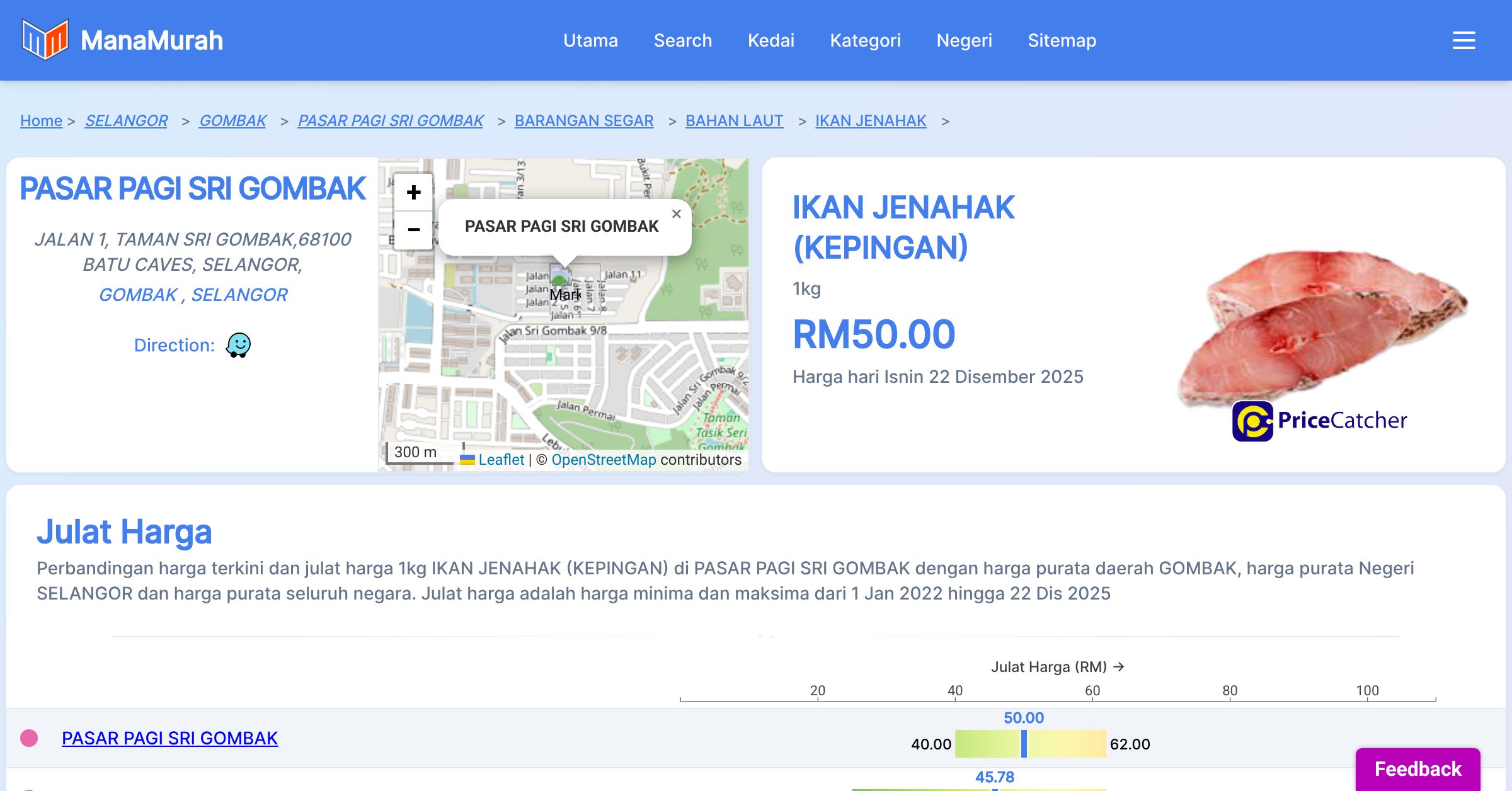 Perbandingan harga terkini dan julat harga 1kg IKAN JENAHAK (KEPINGAN) di PASAR PAGI SRI GOMBAK dengan harga purata daerah GOMBAK, harga purata Negeri SELANGOR dan harga purata seluruh negara. Julat harga adalah harga minima dan maksima dari 1 Jan 2022 hingga 22 Dis 2025