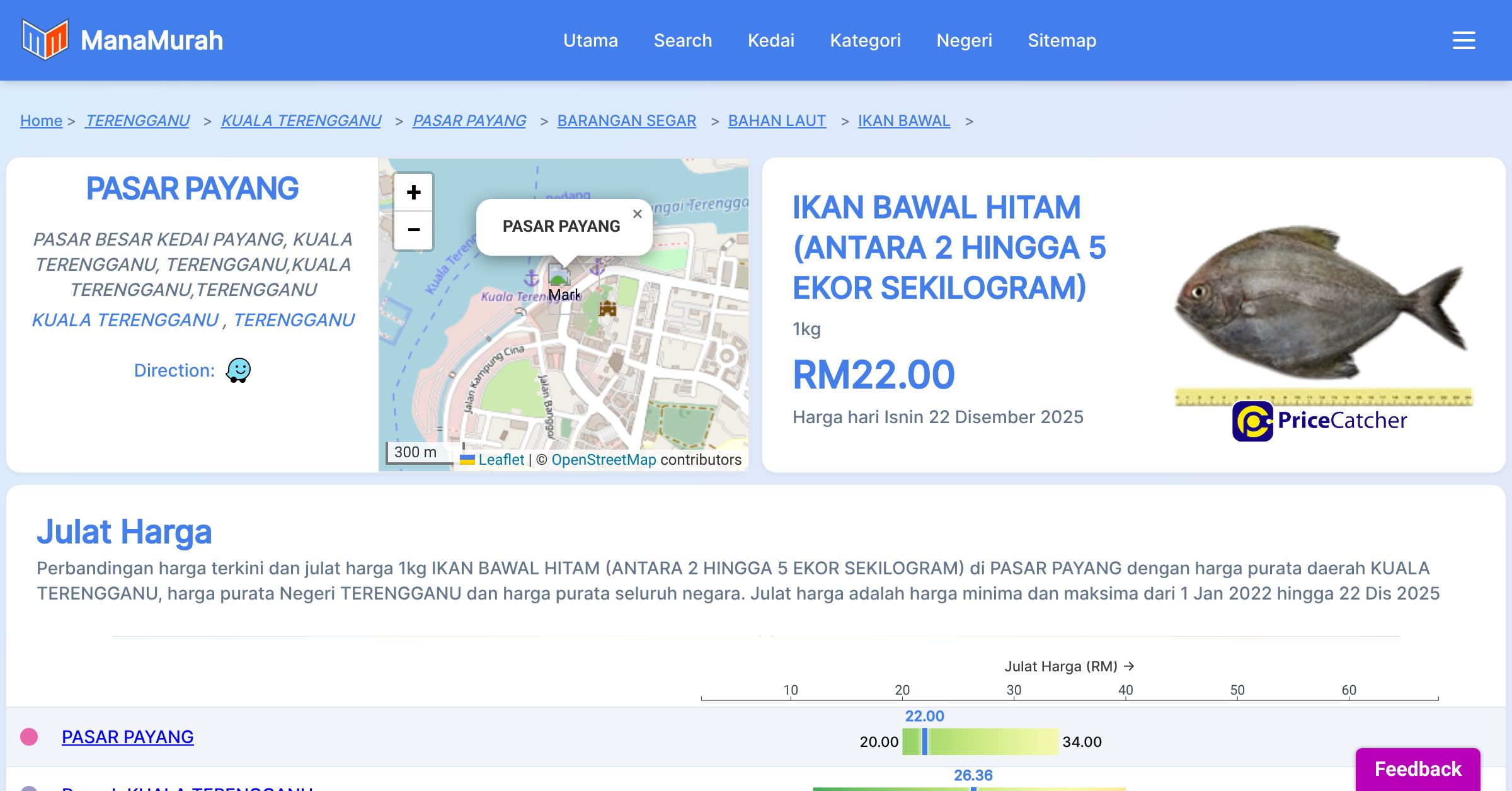 Perbandingan harga terkini dan julat harga 1kg IKAN BAWAL HITAM (ANTARA 2 HINGGA 5 EKOR SEKILOGRAM) di PASAR PAYANG dengan harga purata daerah KUALA TERENGGANU, harga purata Negeri TERENGGANU dan harga purata seluruh negara. Julat harga adalah harga minima dan maksima dari 1 Jan 2022 hingga 22 Dis 2025