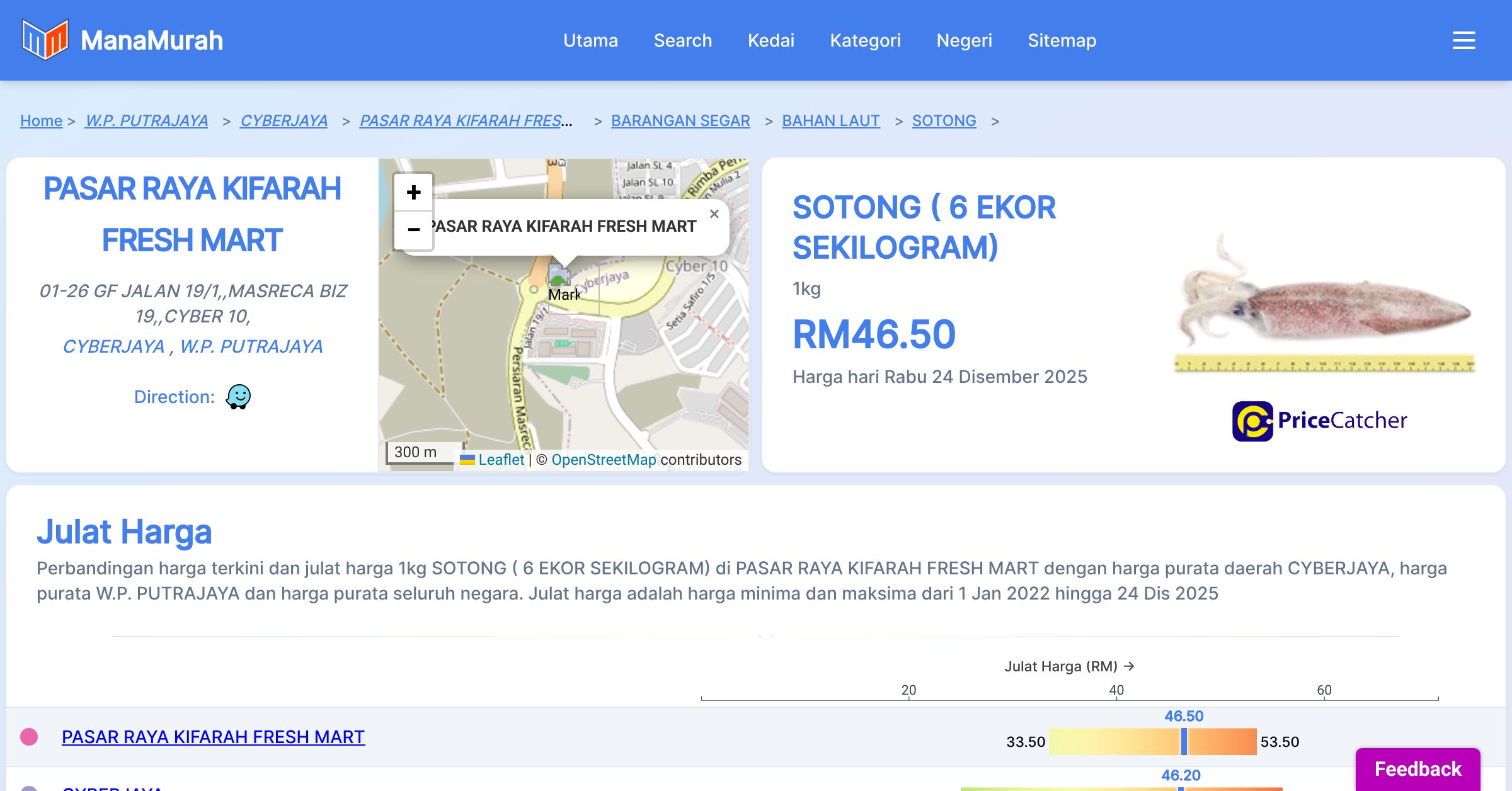 Harga purata tahunan 1kg SOTONG ( 6 EKOR SEKILOGRAM) di PASAR RAYA KIFARAH FRESH MART berbanding harga purata daerah CYBERJAYA, harga purata W.P. PUTRAJAYA dan harga purata seluruh negara