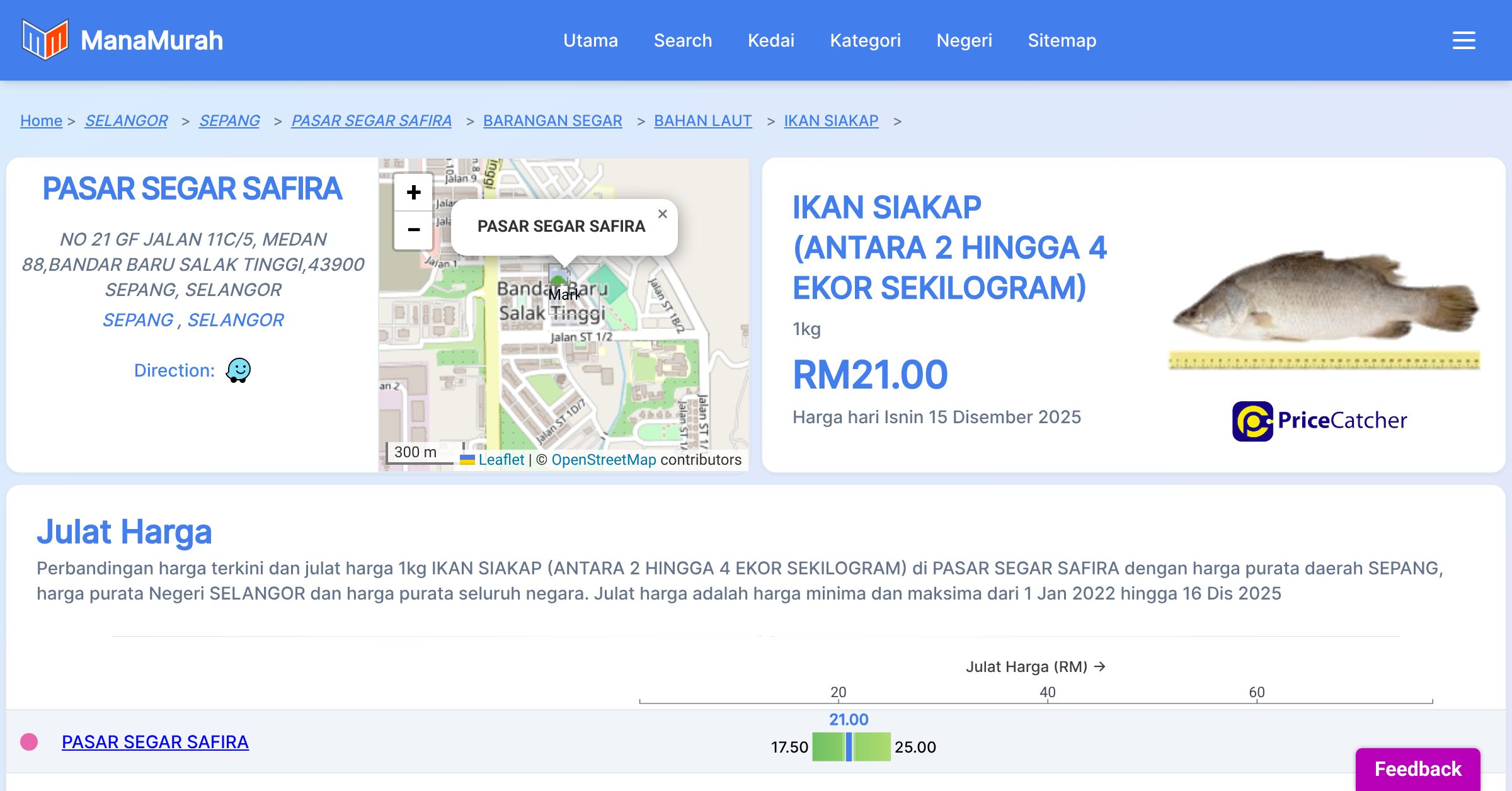 Perbandingan harga terkini dan julat harga 1kg IKAN SIAKAP (ANTARA 2 HINGGA 4 EKOR SEKILOGRAM) di PASAR SEGAR SAFIRA dengan harga purata daerah SEPANG, harga purata Negeri SELANGOR dan harga purata seluruh negara. Julat harga adalah harga minima dan maksima dari 1 Jan 2022 hingga 16 Dis 2025