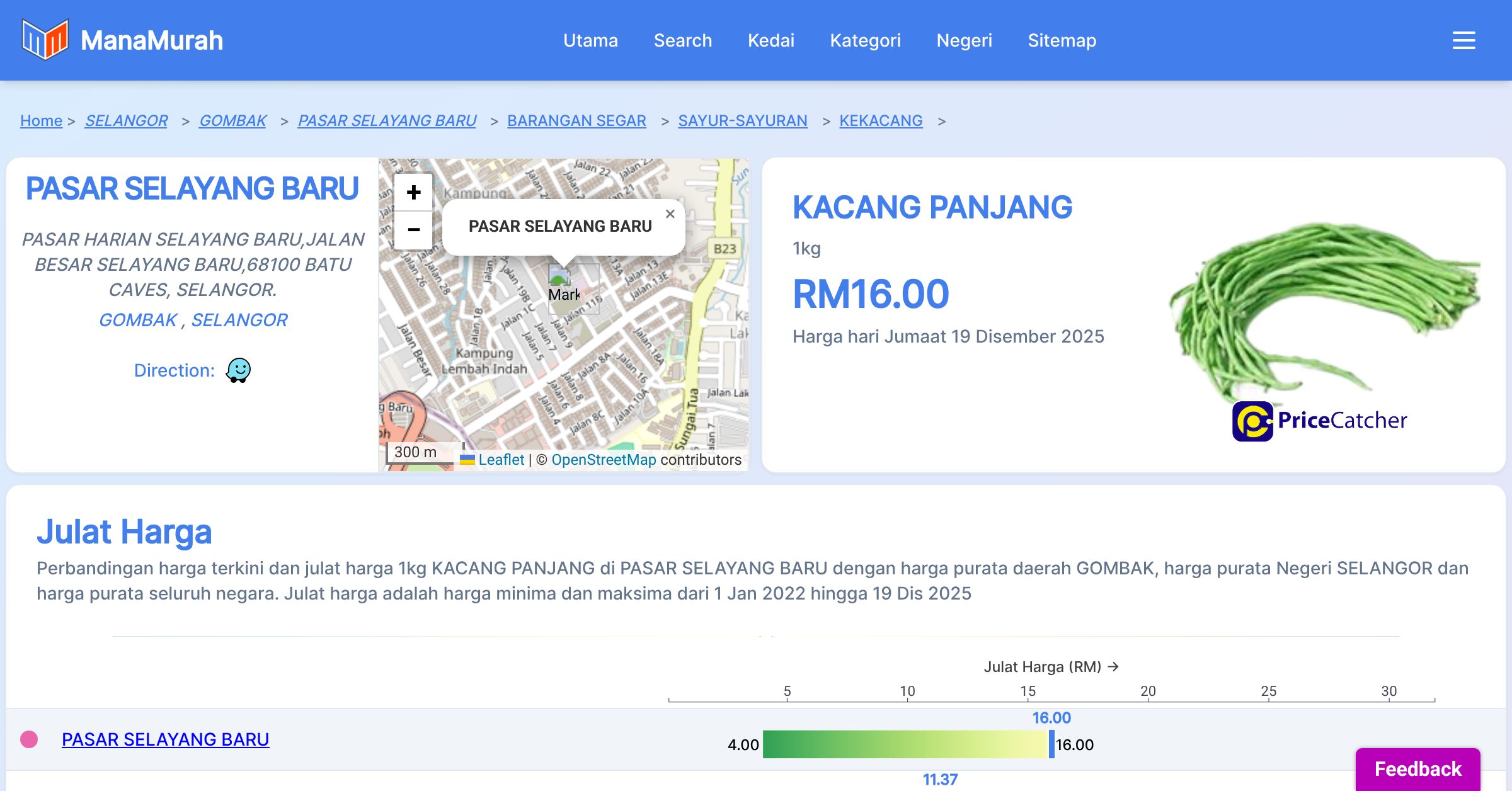 Perbandingan harga terkini dan julat harga 1kg KACANG PANJANG di PASAR SELAYANG BARU dengan harga purata daerah GOMBAK, harga purata Negeri SELANGOR dan harga purata seluruh negara. Julat harga adalah harga minima dan maksima dari 1 Jan 2022 hingga 19 Dis 2025