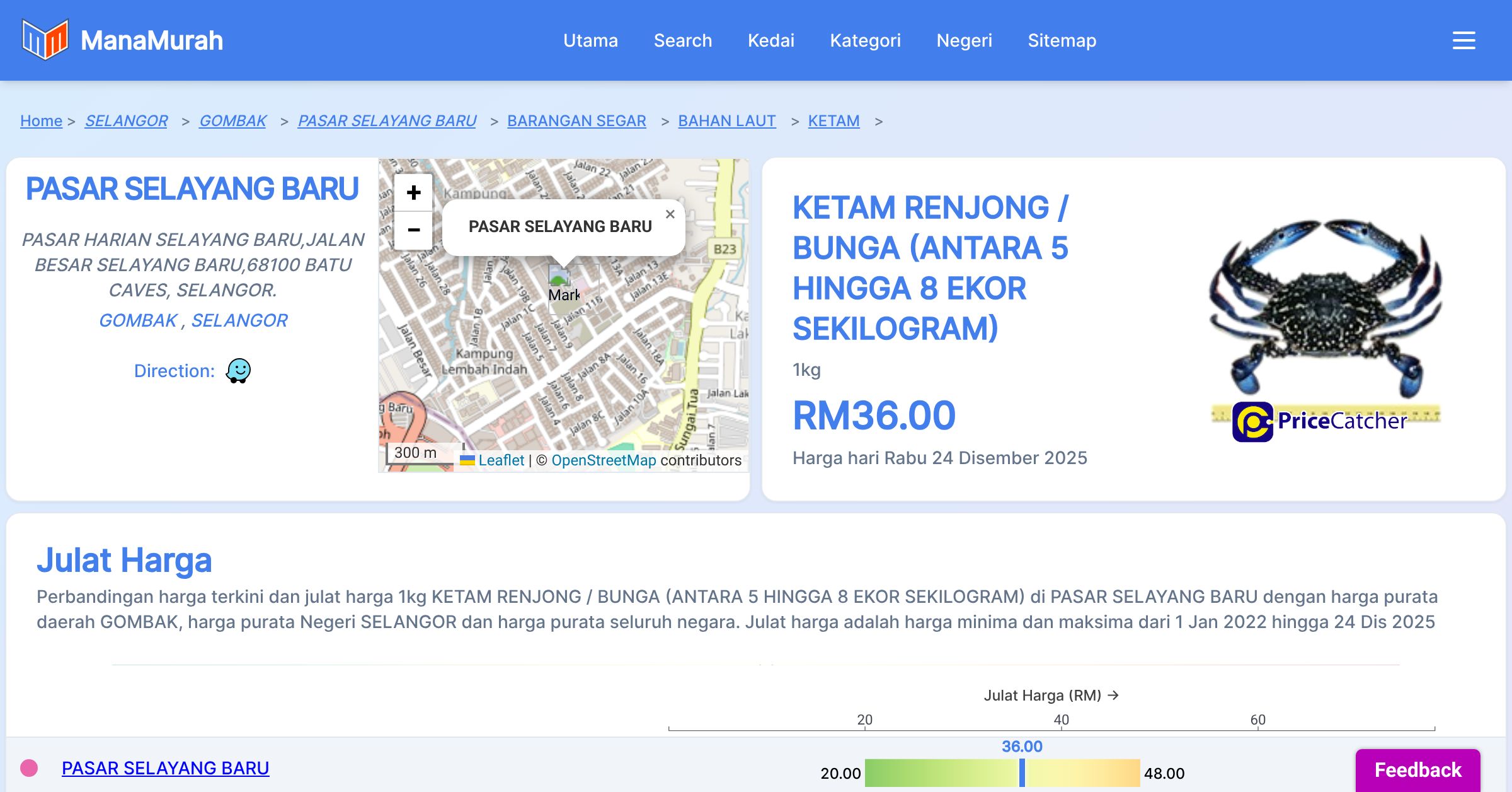 Perubahan harga purata mingguan 1kg KETAM RENJONG/BUNGA (ANTARA 5 HINGGA 8 EKOR SEKILOGRAM) di PASAR SELAYANG BARU berbanding harga purata mingguan daerah GOMBAK, harga purata mingguan negeri SELANGOR dan harga purata mingguan seluruh negara sehingga 24 Dis 2025