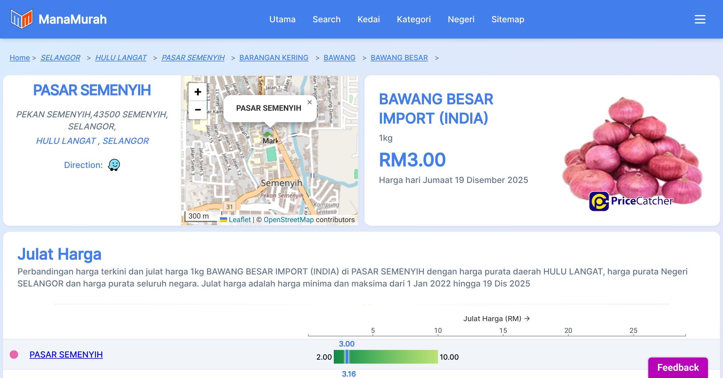 Perbandingan harga terkini dan julat harga 1kg BAWANG BESAR IMPORT (INDIA) di PASAR SEMENYIH dengan harga purata daerah HULU LANGAT, harga purata Negeri SELANGOR dan harga purata seluruh negara. Julat harga adalah harga minima dan maksima dari 1 Jan 2022 hingga 18 Dis 2025