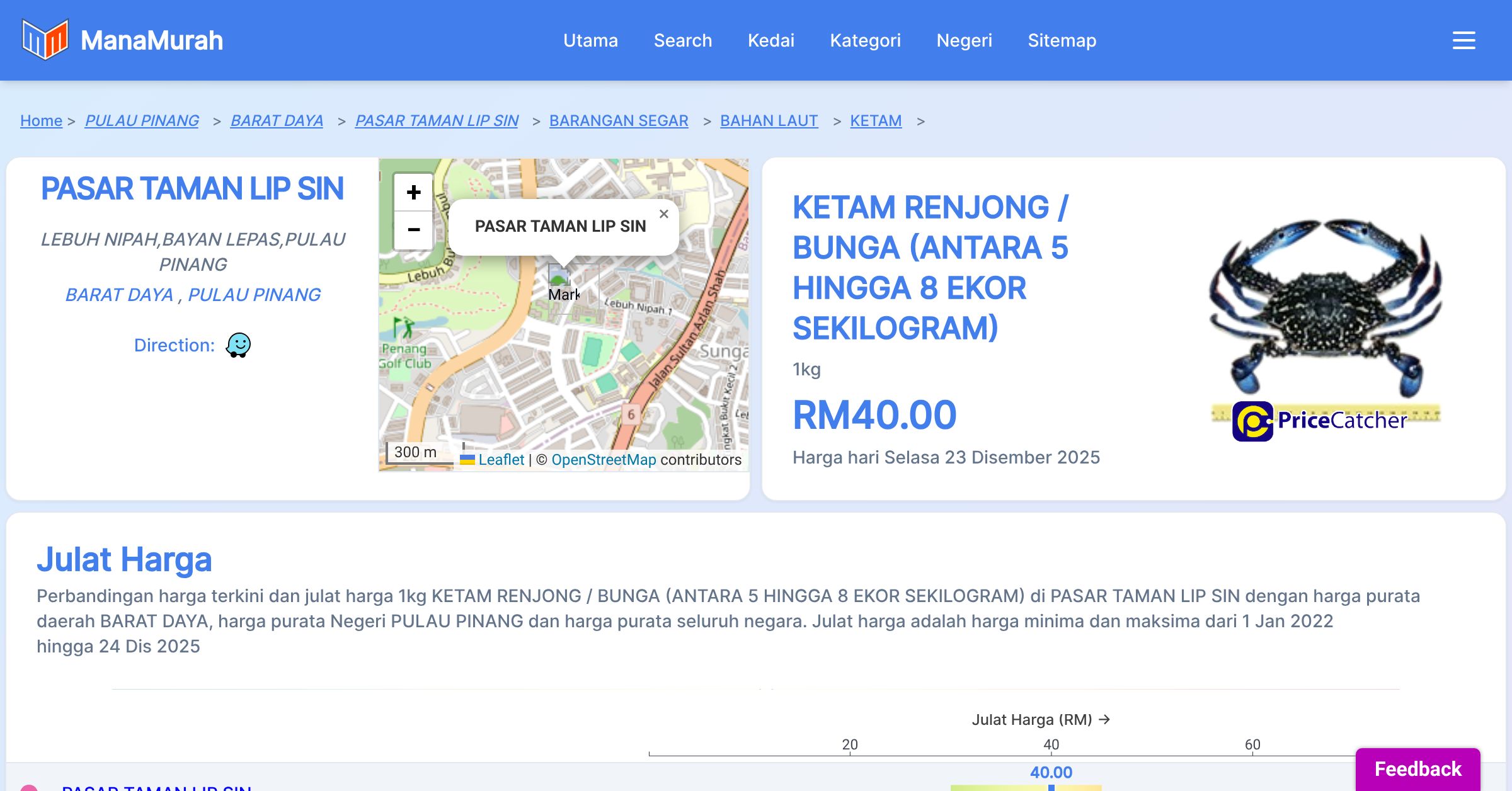 Perubahan harga purata mingguan 1kg KETAM RENJONG/BUNGA (ANTARA 5 HINGGA 8 EKOR SEKILOGRAM) di PASAR TAMAN LIP SIN berbanding harga purata mingguan daerah BARAT DAYA, harga purata mingguan negeri PULAU PINANG dan harga purata mingguan seluruh negara sehingga 24 Dis 2025