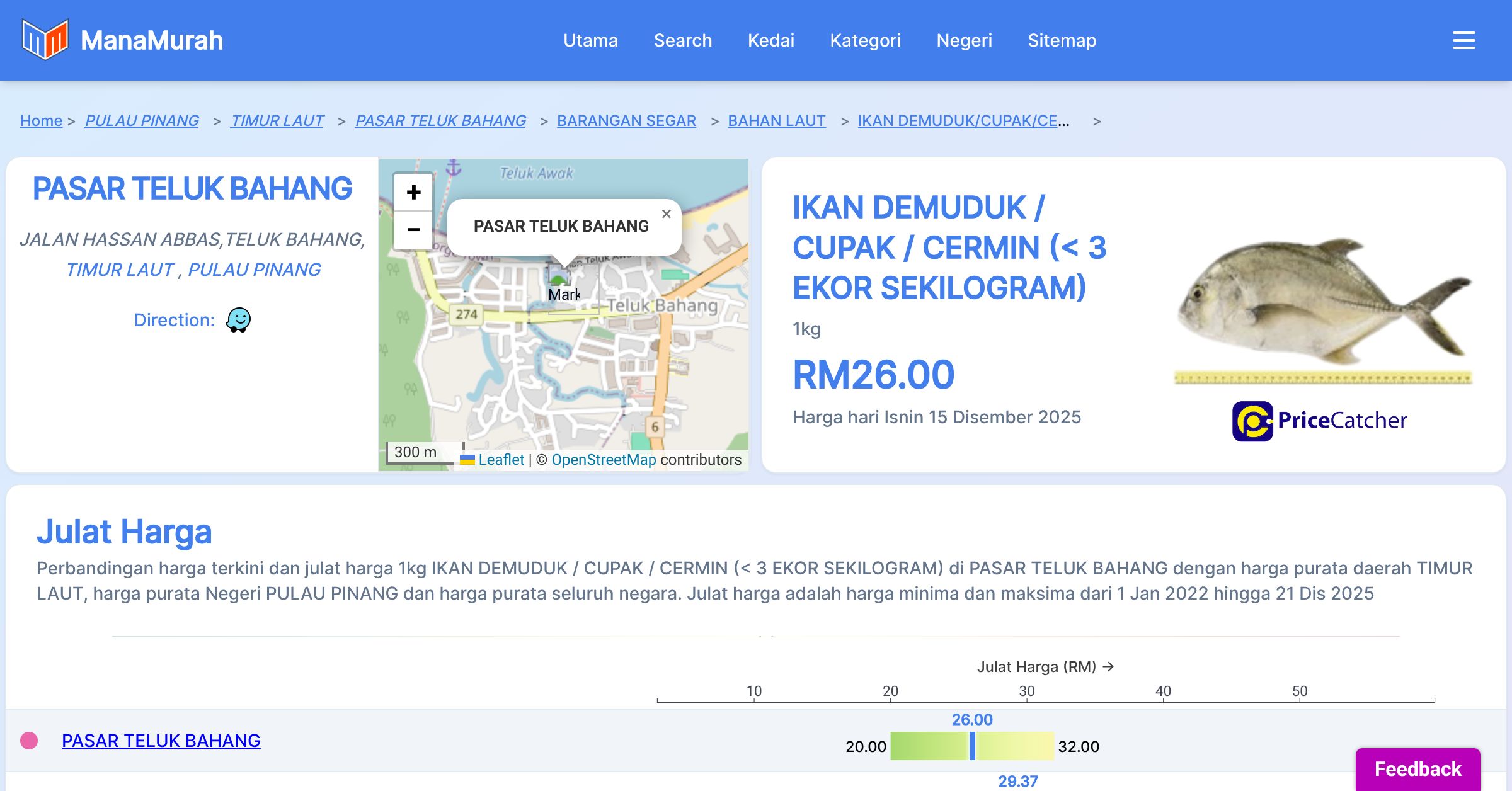 Perbandingan harga terkini dan julat harga 1kg IKAN DEMUDUK / CUPAK / CERMIN (< 3 EKOR SEKILOGRAM) di PASAR TELUK BAHANG dengan harga purata daerah TIMUR LAUT, harga purata Negeri PULAU PINANG dan harga purata seluruh negara. Julat harga adalah harga minima dan maksima dari 1 Jan 2022 hingga 21 Dis 2025