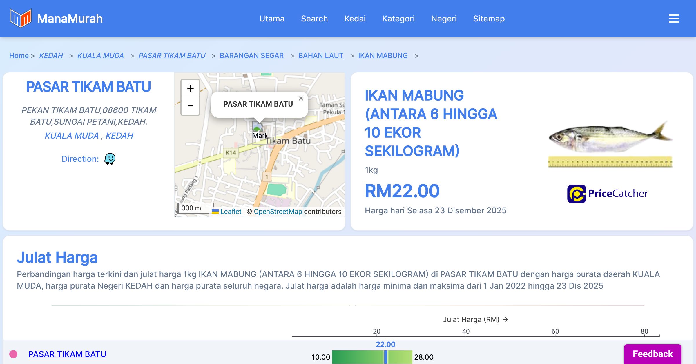 Perbandingan harga terkini dan julat harga 1kg IKAN MABUNG (ANTARA 6 HINGGA 10 EKOR SEKILOGRAM) di PASAR TIKAM BATU dengan harga purata daerah KUALA MUDA, harga purata Negeri KEDAH dan harga purata seluruh negara. Julat harga adalah harga minima dan maksima dari 1 Jan 2022 hingga 23 Dis 2025