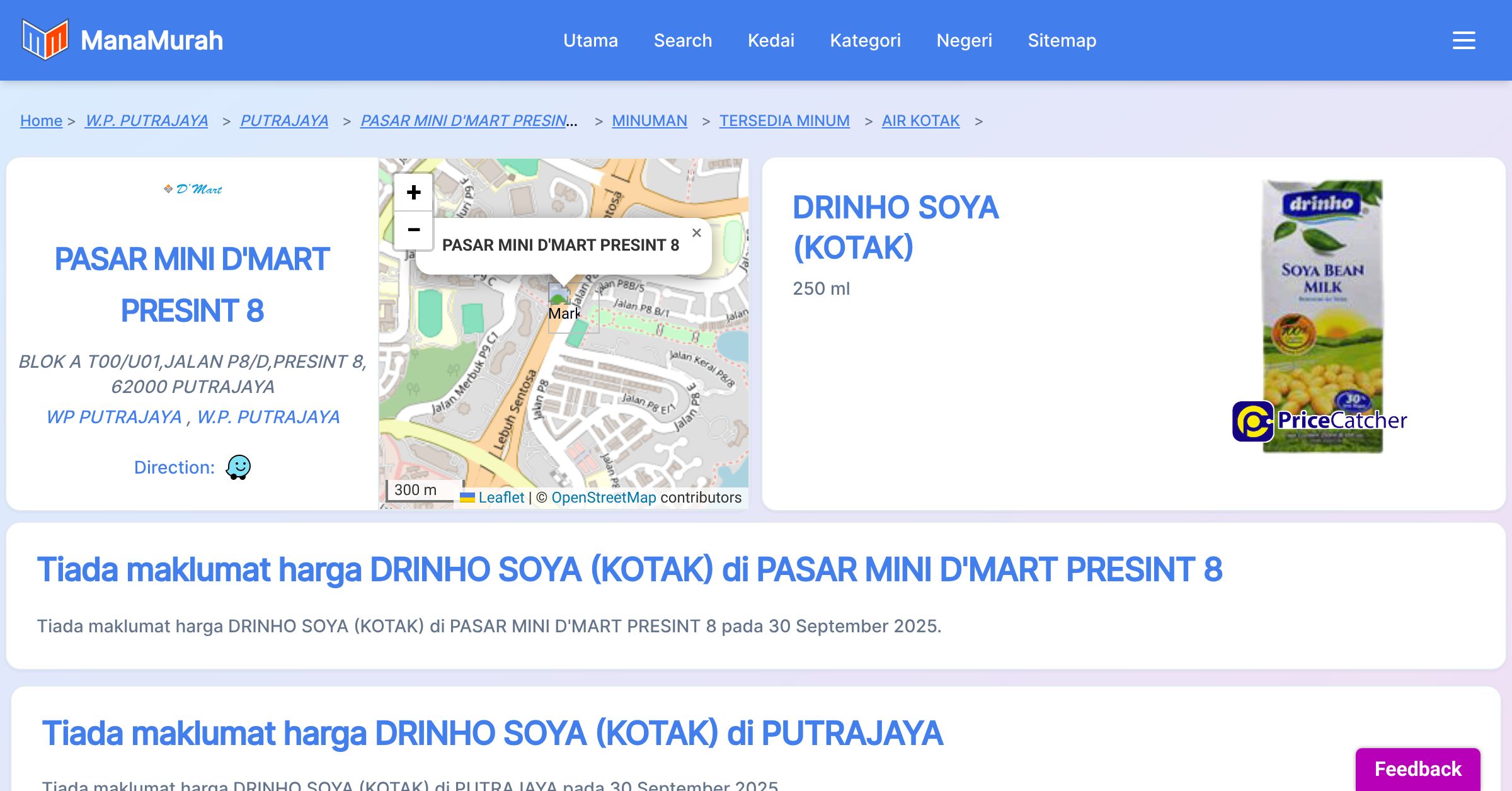 Harga purata mingguan 250 ml DRINHO SOYA (KOTAK) di PASAR MINI D'MART PRESINT 8 berbanding harga purata daerah PUTRAJAYA, harga purata W.P. PUTRAJAYA dan harga purata seluruh negara