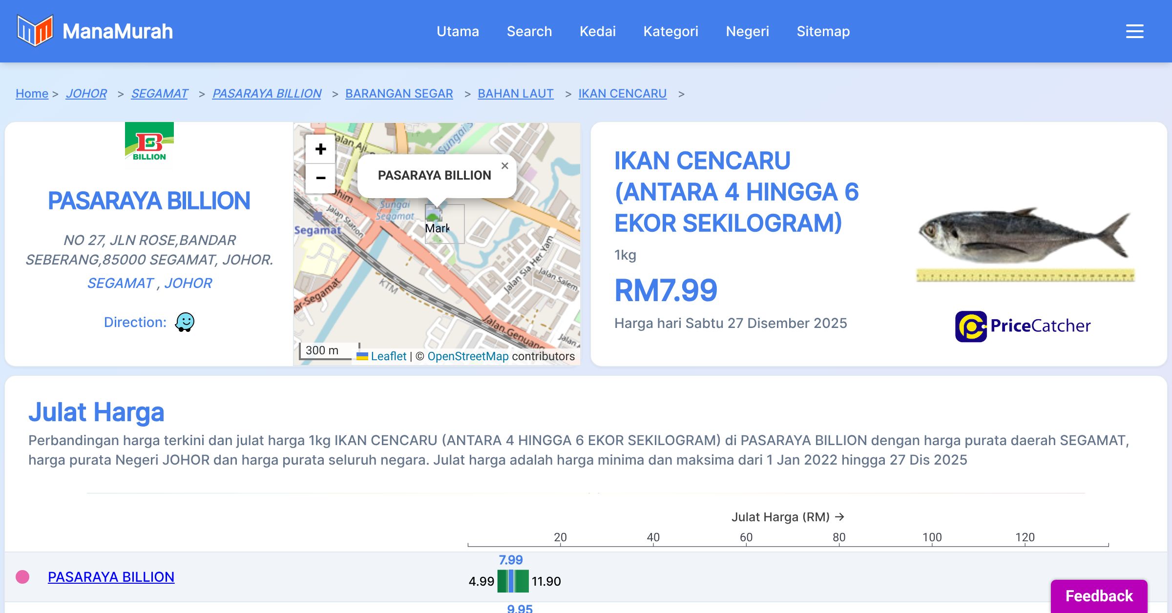 Perbandingan harga terkini dan julat harga 1kg IKAN CENCARU (ANTARA 4 HINGGA 6 EKOR SEKILOGRAM) di PASARAYA BILLION dengan harga purata daerah SEGAMAT, harga purata Negeri JOHOR dan harga purata seluruh negara. Julat harga adalah harga minima dan maksima dari 1 Jan 2022 hingga 27 Dis 2025