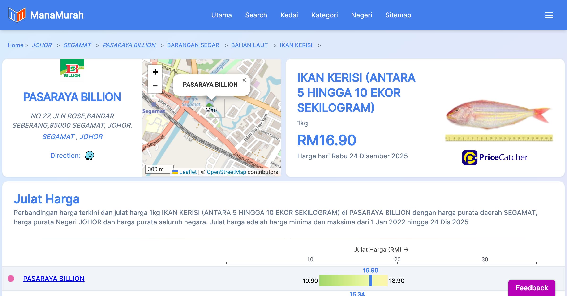 Perbandingan harga terkini dan julat harga 1kg IKAN KERISI (ANTARA 5 HINGGA 10 EKOR SEKILOGRAM) di PASARAYA BILLION dengan harga purata daerah SEGAMAT, harga purata Negeri JOHOR dan harga purata seluruh negara. Julat harga adalah harga minima dan maksima dari 1 Jan 2022 hingga 24 Dis 2025