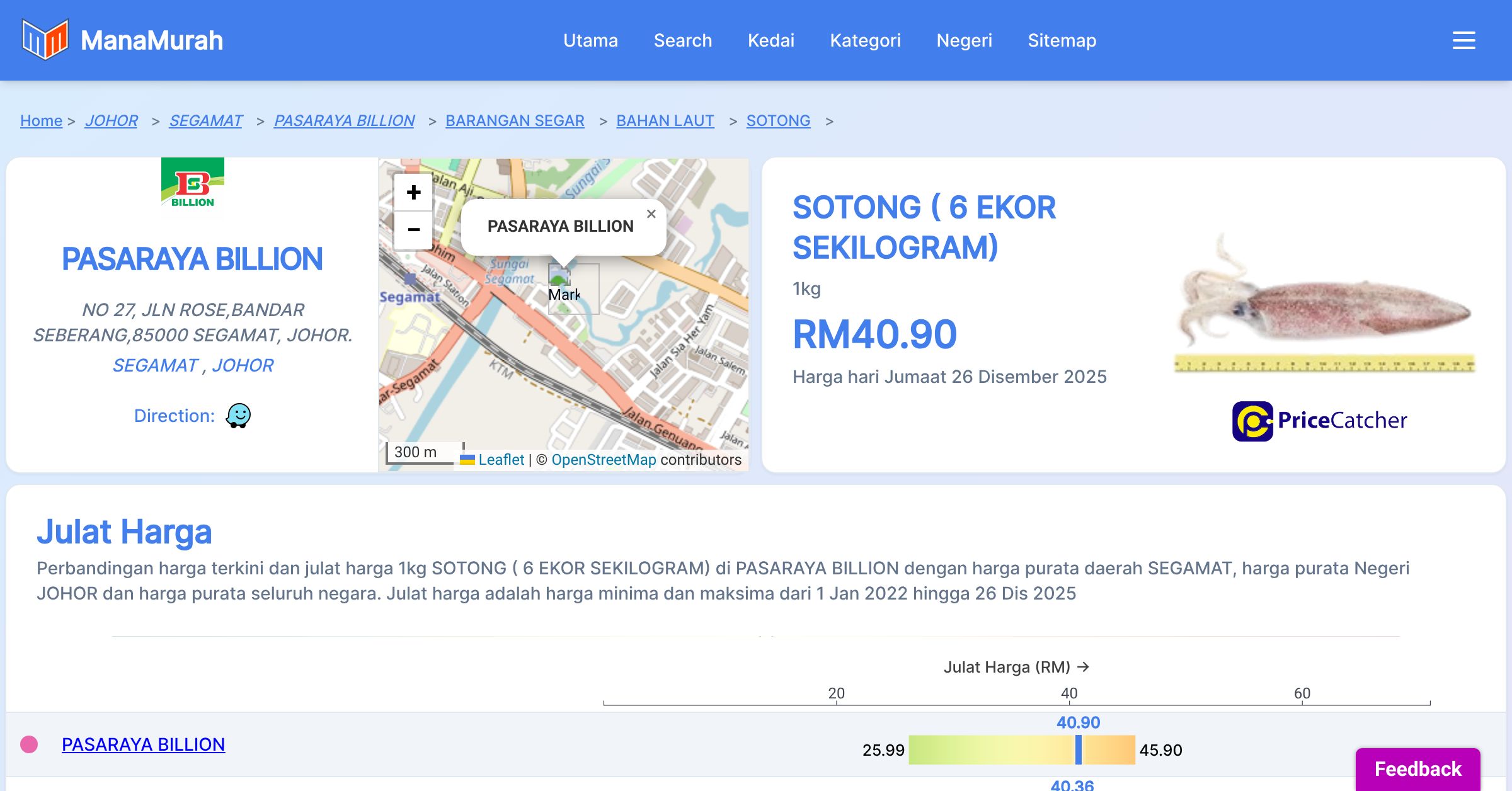 Perbandingan harga terkini dan julat harga 1kg SOTONG ( 6 EKOR SEKILOGRAM) di PASARAYA BILLION dengan harga purata daerah SEGAMAT, harga purata Negeri JOHOR dan harga purata seluruh negara. Julat harga adalah harga minima dan maksima dari 1 Jan 2022 hingga 26 Dis 2025
