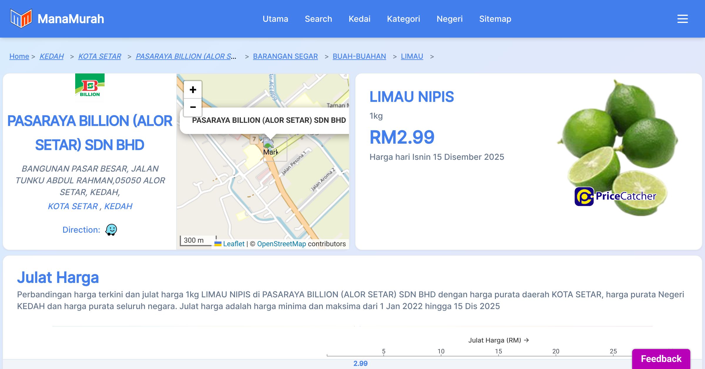 Harga purata tahunan 1kg LIMAU NIPIS di PASARAYA BILLION (ALOR SETAR) SDN BHD berbanding harga purata daerah KOTA SETAR, harga purata Negeri KEDAH dan harga purata seluruh negara