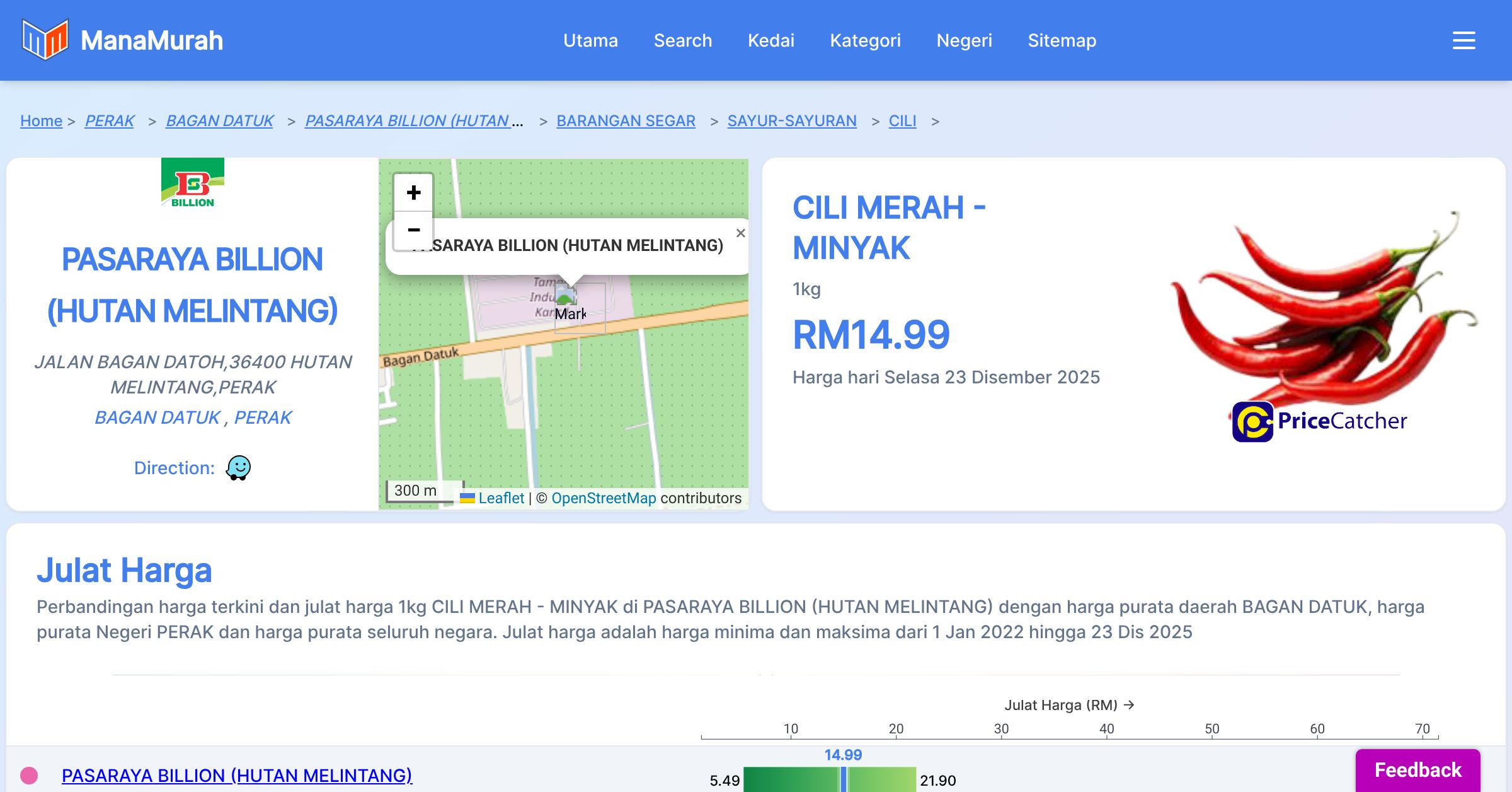 Perbandingan harga terkini dan julat harga 1kg CILI MERAH - MINYAK di PASARAYA BILLION (HUTAN MELINTANG) dengan harga purata daerah BAGAN DATUK, harga purata Negeri PERAK dan harga purata seluruh negara. Julat harga adalah harga minima dan maksima dari 1 Jan 2022 hingga 23 Dis 2025