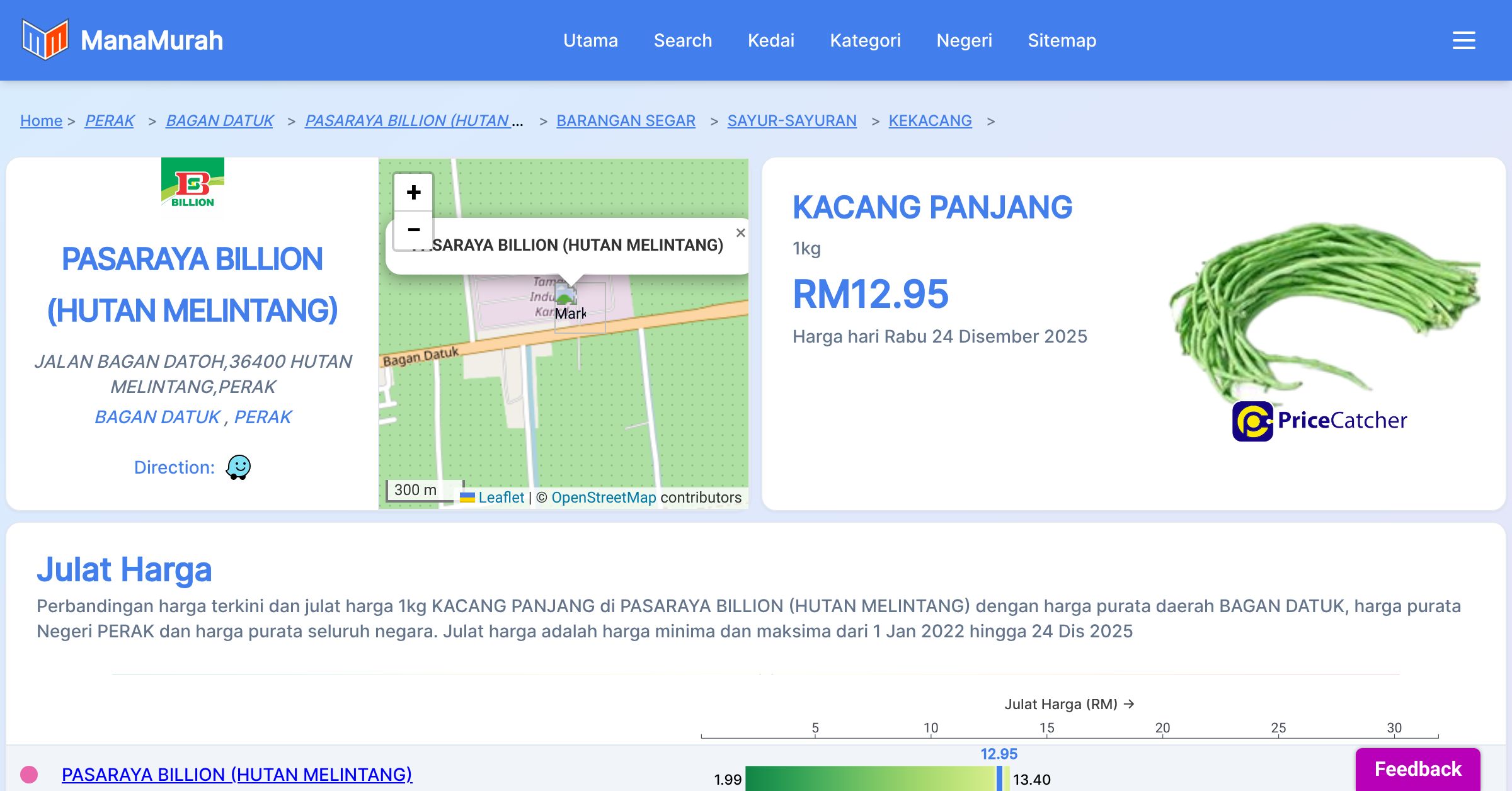 Perbandingan harga terkini dan julat harga 1kg KACANG PANJANG di PASARAYA BILLION (HUTAN MELINTANG) dengan harga purata daerah BAGAN DATUK, harga purata Negeri PERAK dan harga purata seluruh negara. Julat harga adalah harga minima dan maksima dari 1 Jan 2022 hingga 24 Dis 2025