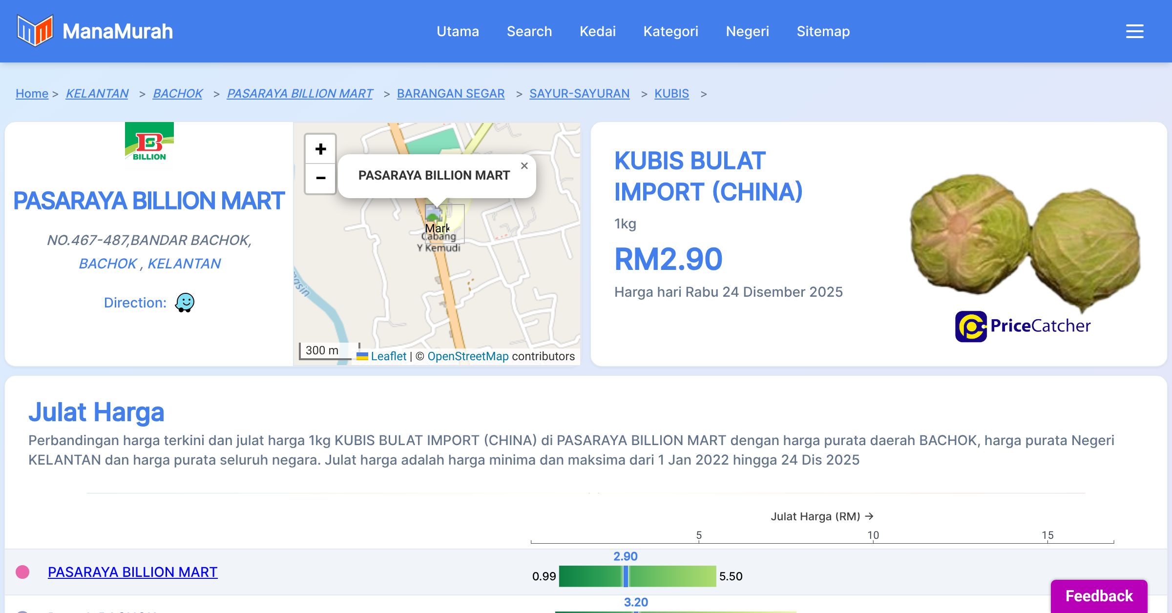 Perbandingan harga terkini dan julat harga 1kg KUBIS BULAT IMPORT (CHINA) di PASARAYA BILLION MART dengan harga purata daerah BACHOK, harga purata Negeri KELANTAN dan harga purata seluruh negara. Julat harga adalah harga minima dan maksima dari 1 Jan 2022 hingga 24 Dis 2025