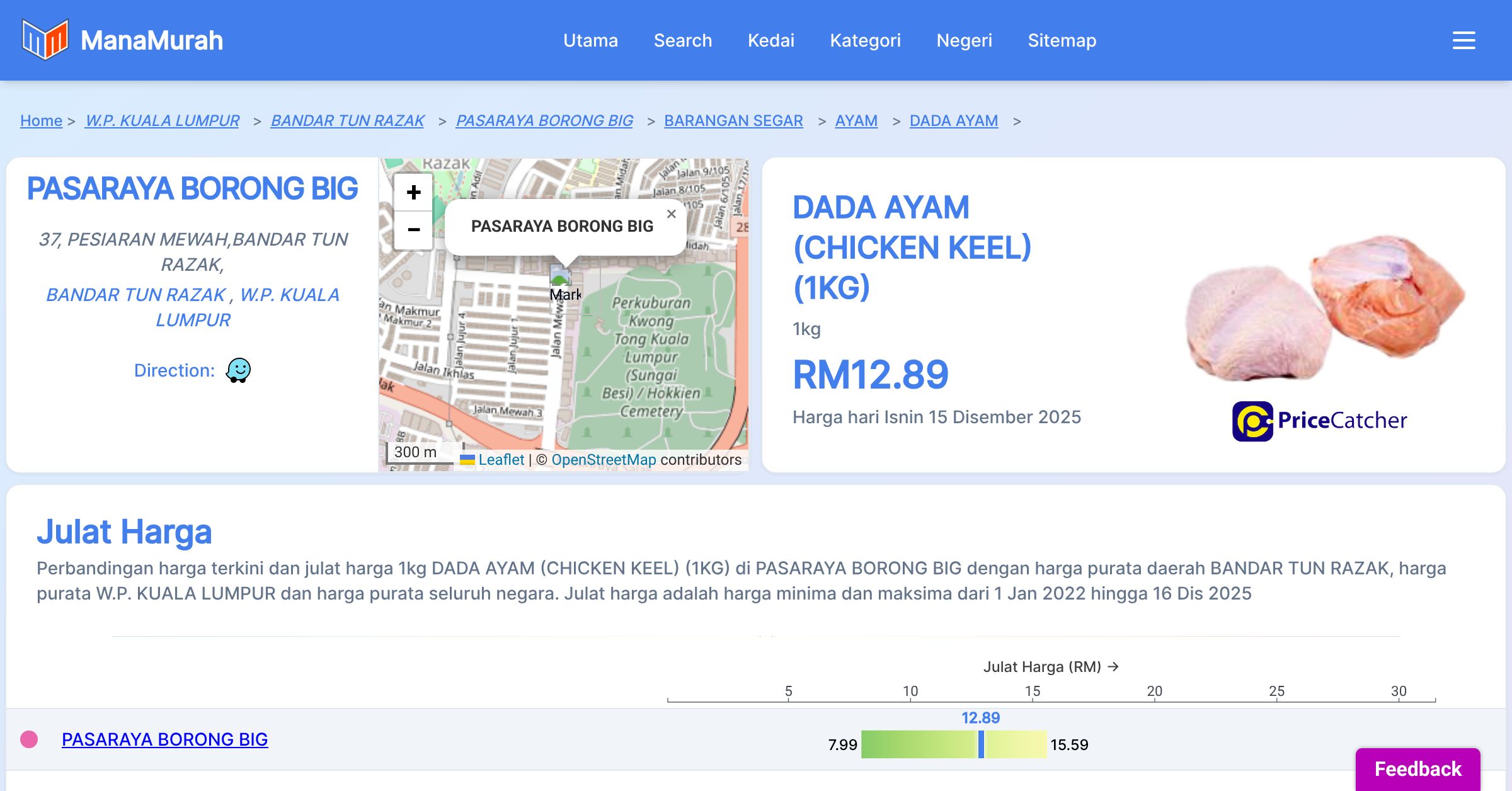 Harga purata bulanan 1kg DADA AYAM (CHICKEN KEEL) (1KG) di PASARAYA BORONG BIG berbanding harga purata daerah BANDAR TUN RAZAK, harga purata W.P. KUALA LUMPUR dan harga purata seluruh negara