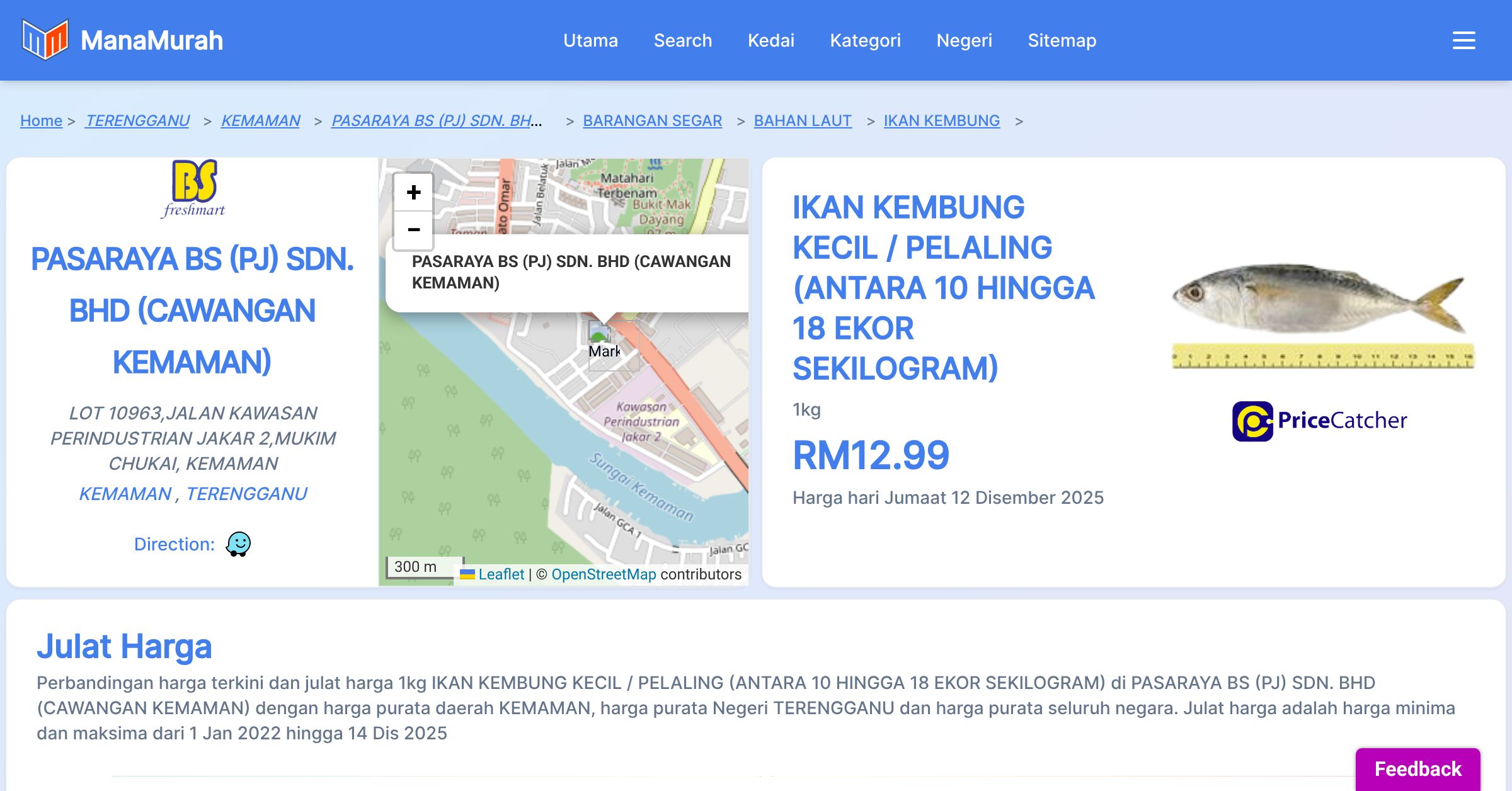 Perbandingan harga terkini dan julat harga 1kg IKAN KEMBUNG KECIL / PELALING (ANTARA 10 HINGGA 18 EKOR SEKILOGRAM) di PASARAYA BS (PJ) SDN. BHD (CAWANGAN KEMAMAN) dengan harga purata daerah KEMAMAN, harga purata Negeri TERENGGANU dan harga purata seluruh negara. Julat harga adalah harga minima dan maksima dari 1 Jan 2022 hingga 13 Dis 2025