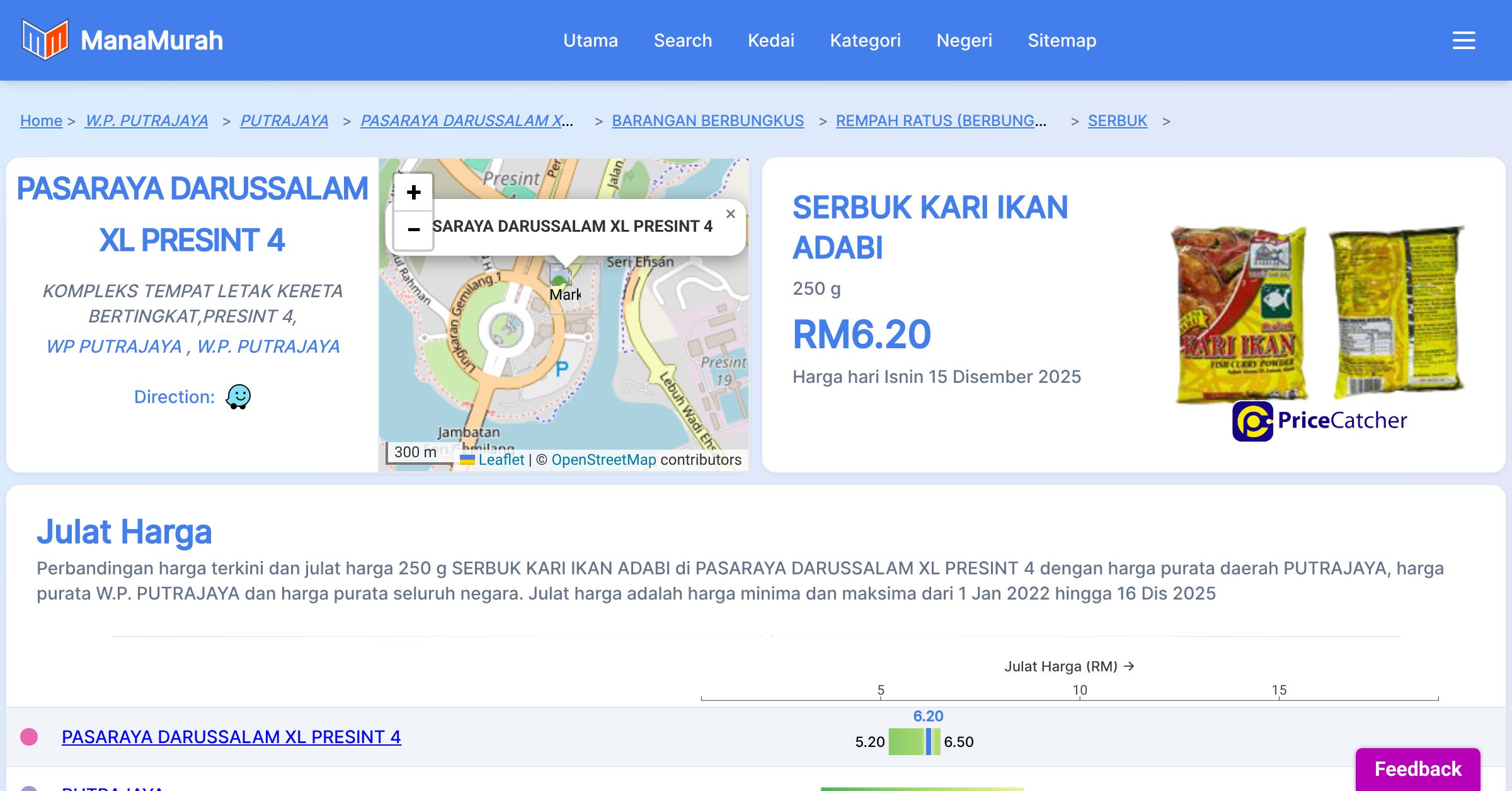 Perbandingan harga terkini dan julat harga 250 g SERBUK KARI IKAN ADABI di PASARAYA DARUSSALAM XL PRESINT 4 dengan harga purata daerah PUTRAJAYA, harga purata W.P. PUTRAJAYA dan harga purata seluruh negara. Julat harga adalah harga minima dan maksima dari 1 Jan 2022 hingga 16 Dis 2025