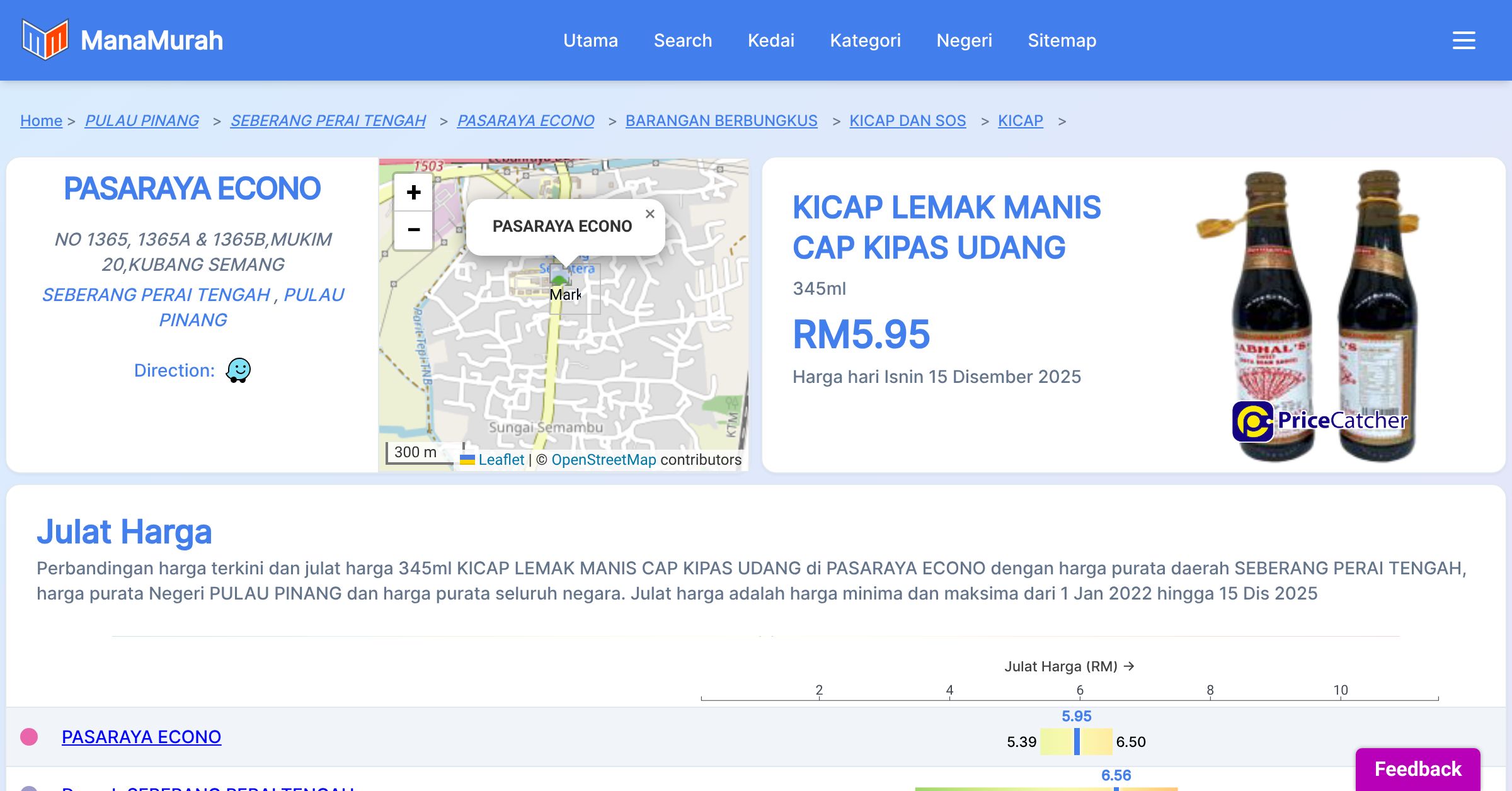 Perbandingan harga terkini dan julat harga 345ml KICAP LEMAK MANIS CAP KIPAS UDANG di PASARAYA ECONO dengan harga purata daerah SEBERANG PERAI TENGAH, harga purata Negeri PULAU PINANG dan harga purata seluruh negara. Julat harga adalah harga minima dan maksima dari 1 Jan 2022 hingga 14 Dis 2025