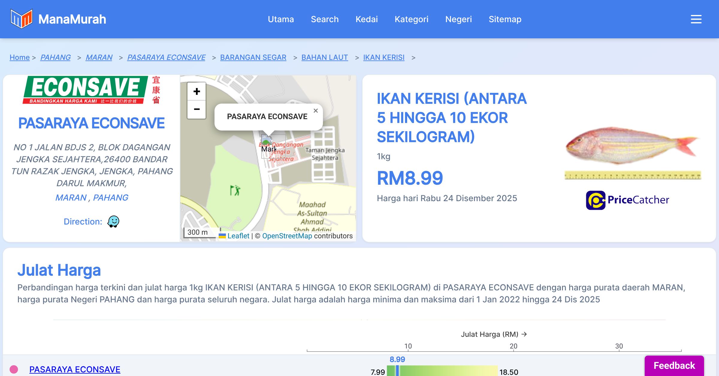 Perbandingan harga terkini dan julat harga 1kg IKAN KERISI (ANTARA 5 HINGGA 10 EKOR SEKILOGRAM) di PASARAYA ECONSAVE dengan harga purata daerah MARAN, harga purata Negeri PAHANG dan harga purata seluruh negara. Julat harga adalah harga minima dan maksima dari 1 Jan 2022 hingga 24 Dis 2025