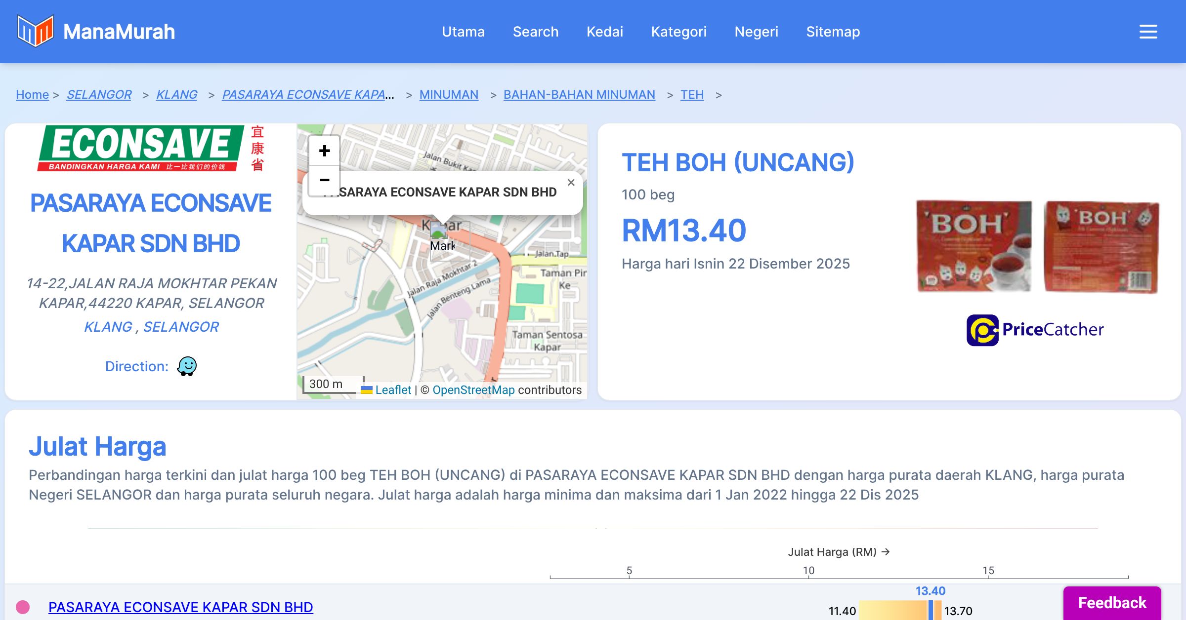 Perbandingan harga terkini dan julat harga 100 beg TEH BOH (UNCANG) di PASARAYA ECONSAVE KAPAR SDN BHD dengan harga purata daerah KLANG, harga purata Negeri SELANGOR dan harga purata seluruh negara. Julat harga adalah harga minima dan maksima dari 1 Jan 2022 hingga 22 Dis 2025