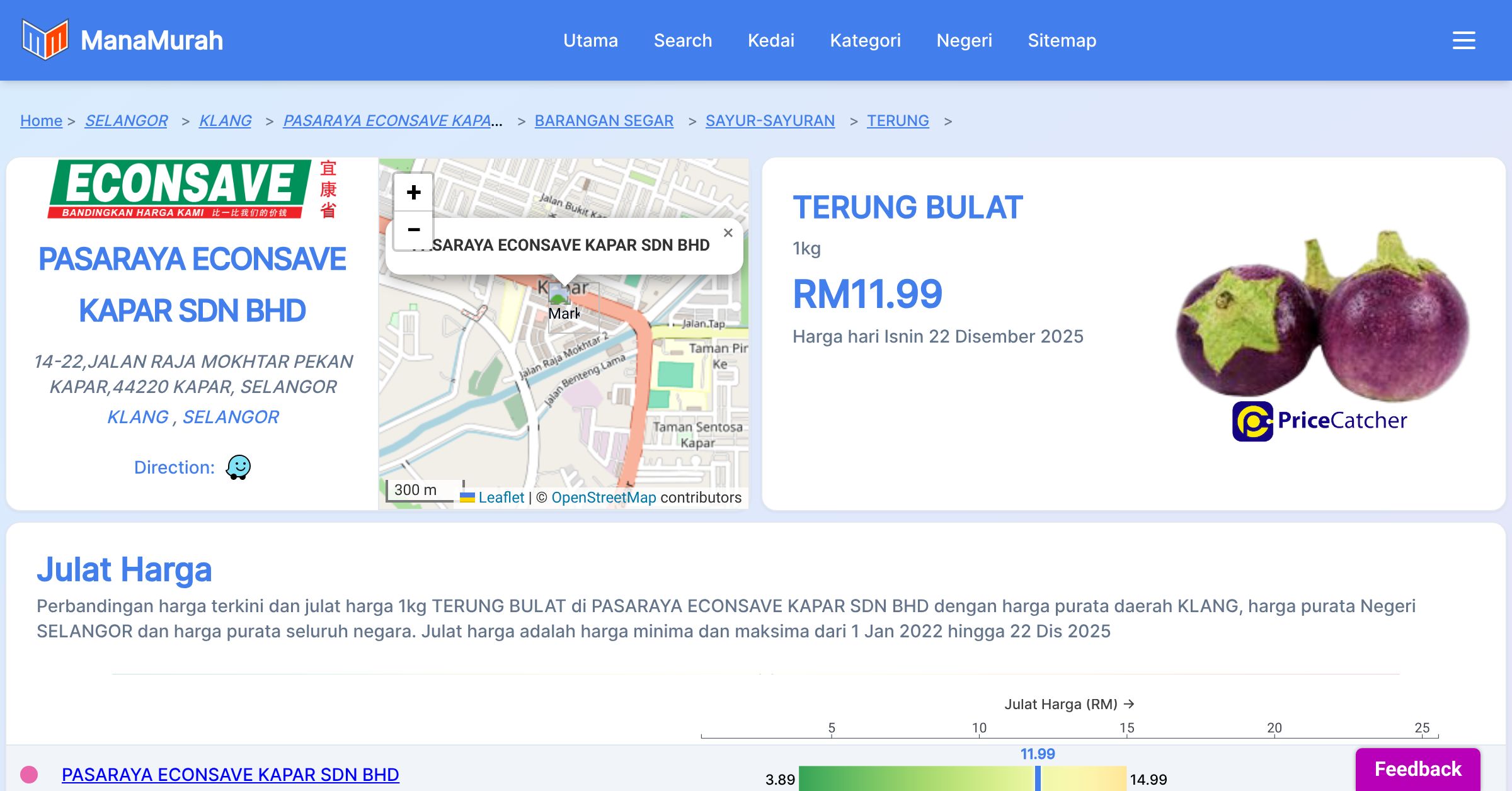 Perbandingan harga terkini dan julat harga 1kg TERUNG BULAT di PASARAYA ECONSAVE KAPAR SDN BHD dengan harga purata daerah KLANG, harga purata Negeri SELANGOR dan harga purata seluruh negara. Julat harga adalah harga minima dan maksima dari 1 Jan 2022 hingga 22 Dis 2025