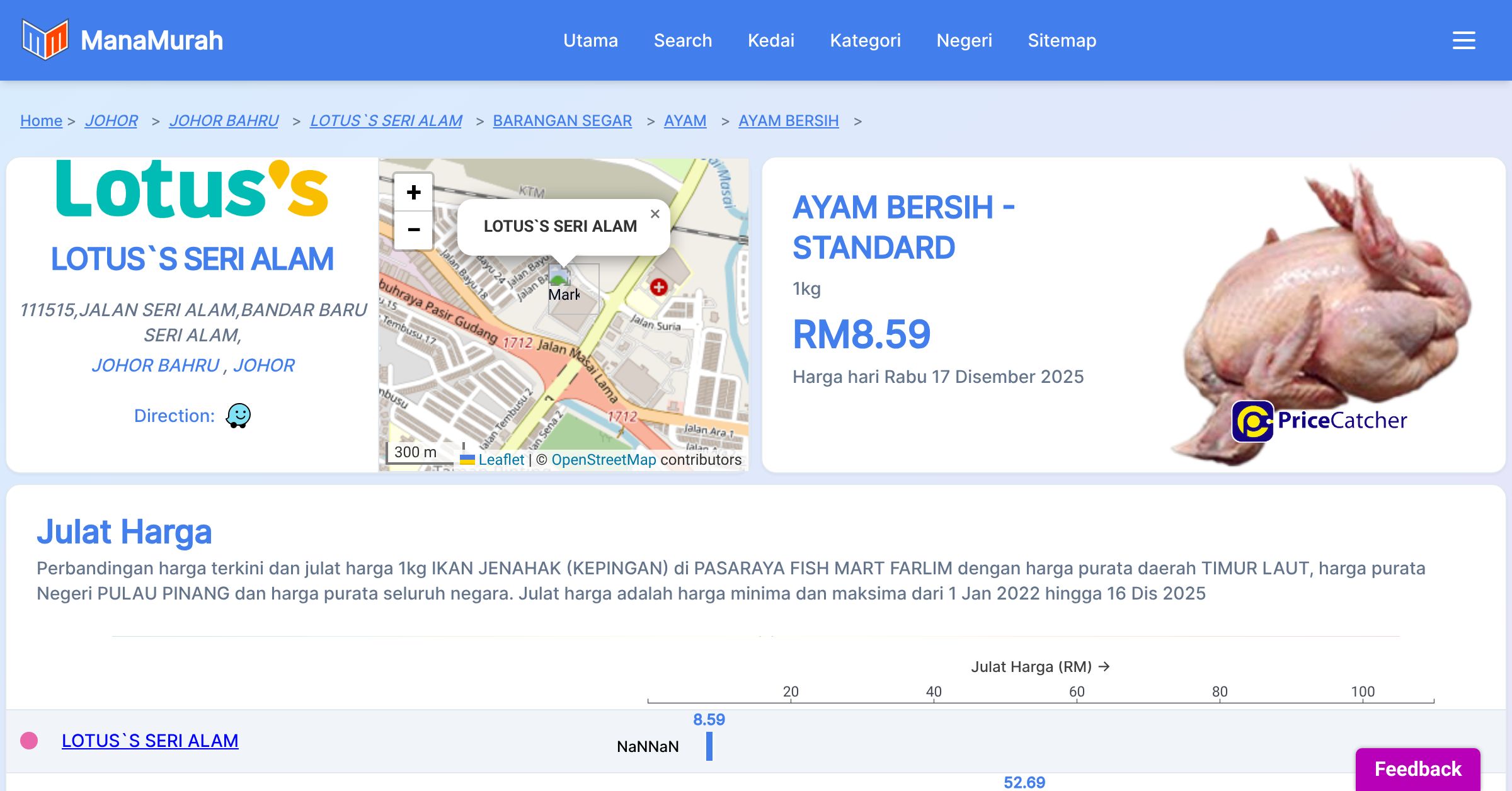 Perbandingan harga terkini dan julat harga 1kg IKAN JENAHAK (KEPINGAN) di PASARAYA FISH MART FARLIM dengan harga purata daerah TIMUR LAUT, harga purata Negeri PULAU PINANG dan harga purata seluruh negara. Julat harga adalah harga minima dan maksima dari 1 Jan 2022 hingga 16 Dis 2025