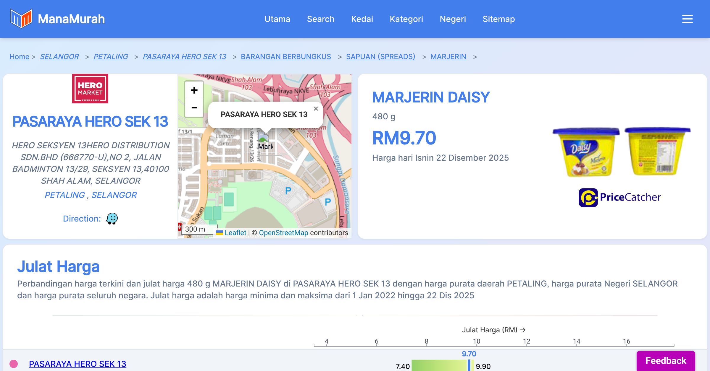 Perbandingan harga terkini dan julat harga 480 g MARJERIN DAISY di PASARAYA HERO SEK 13 dengan harga purata daerah PETALING, harga purata Negeri SELANGOR dan harga purata seluruh negara. Julat harga adalah harga minima dan maksima dari 1 Jan 2022 hingga 22 Dis 2025